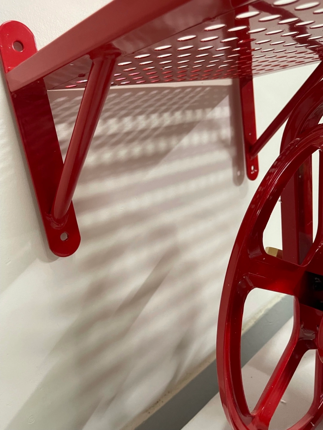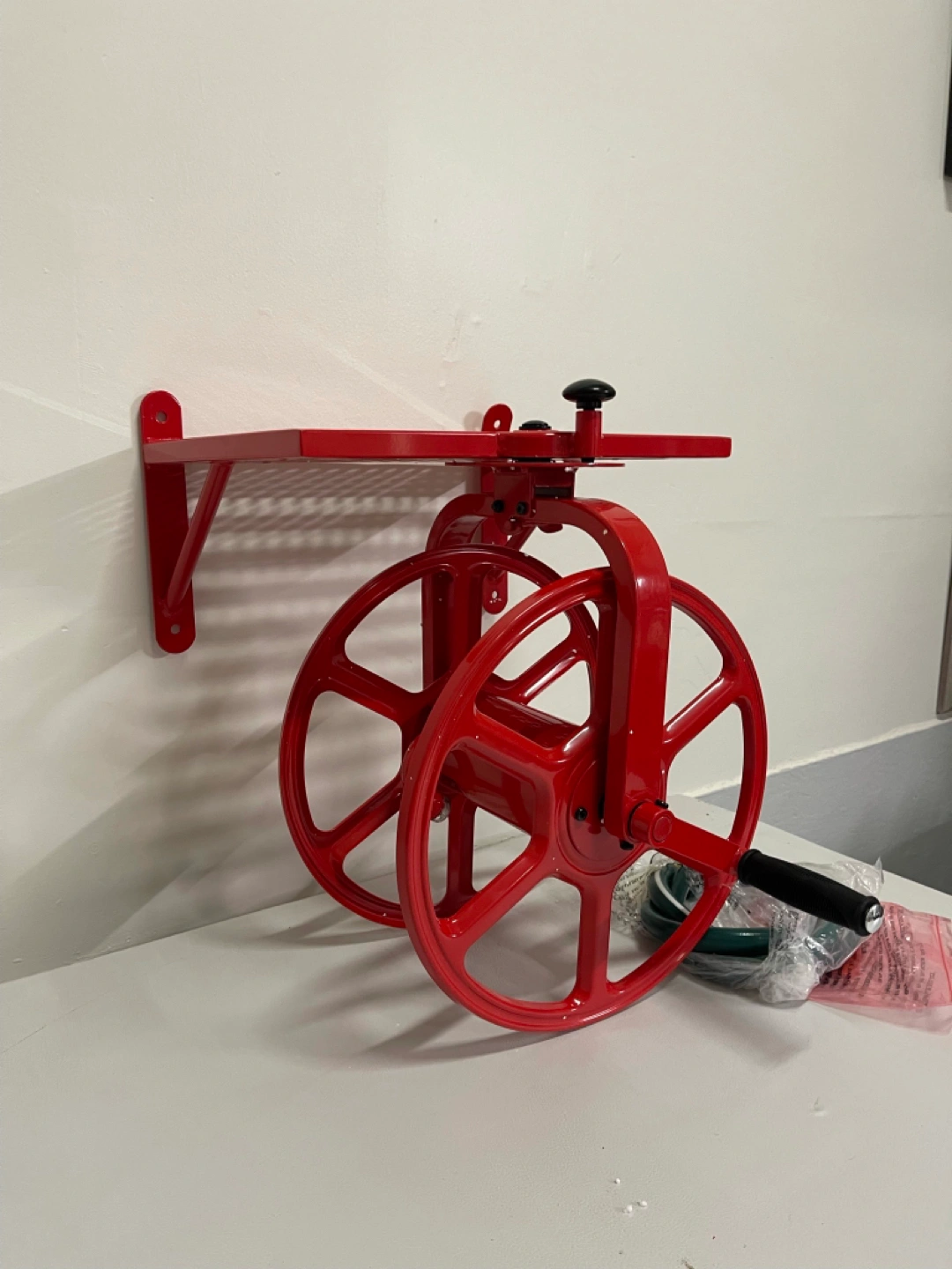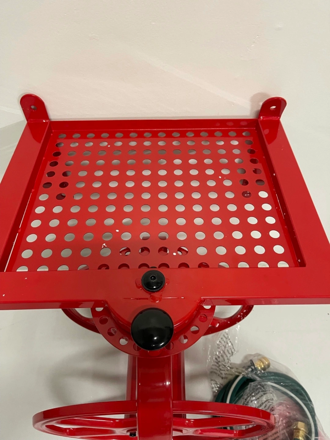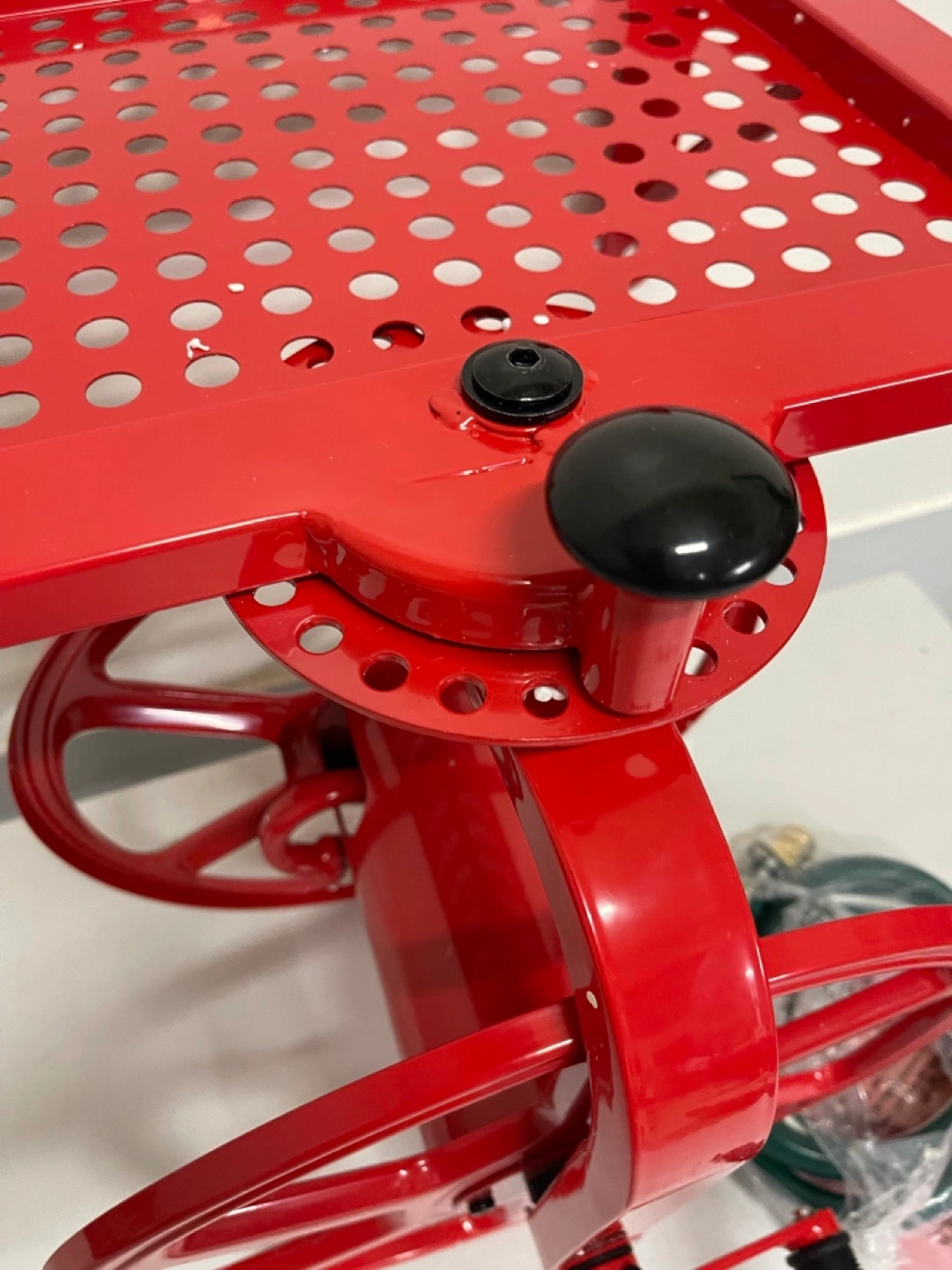 Bright red, 18 gauge steel with durable powder coat finish. 90 degree solid brass swivel helps prevent hose damage during winding. 24 locking positions this hose reel is ideal for jobs small and large. 12”x14” storage tray will hold your watering essentials.