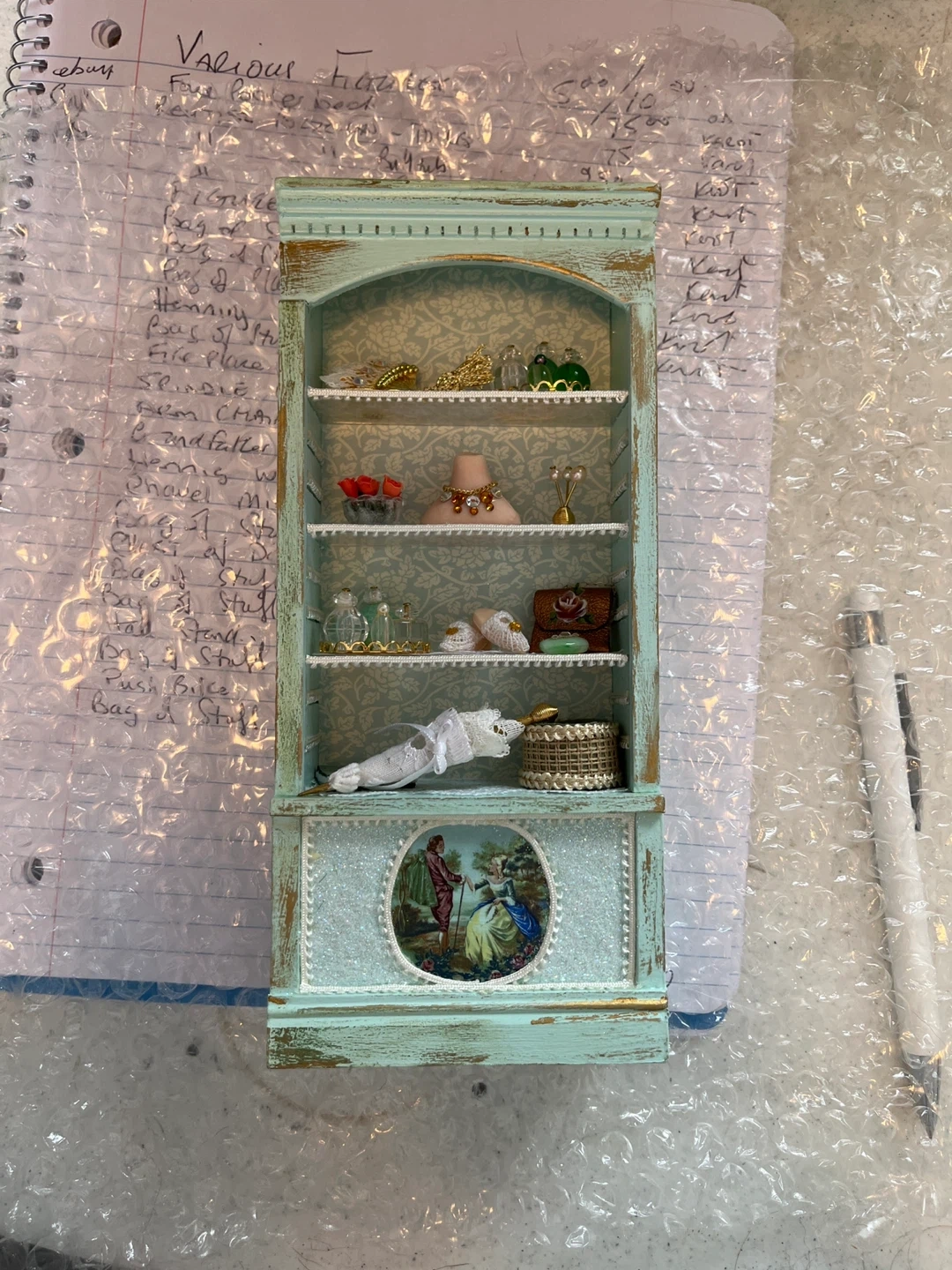 This is a charming miniature display cabinet, perfect for a dollhouse or diorama. It features multiple shelves and a decorative panel at the bottom. The cabinet is painted in a light blue-green with distressed gold accents. 1/12 scale