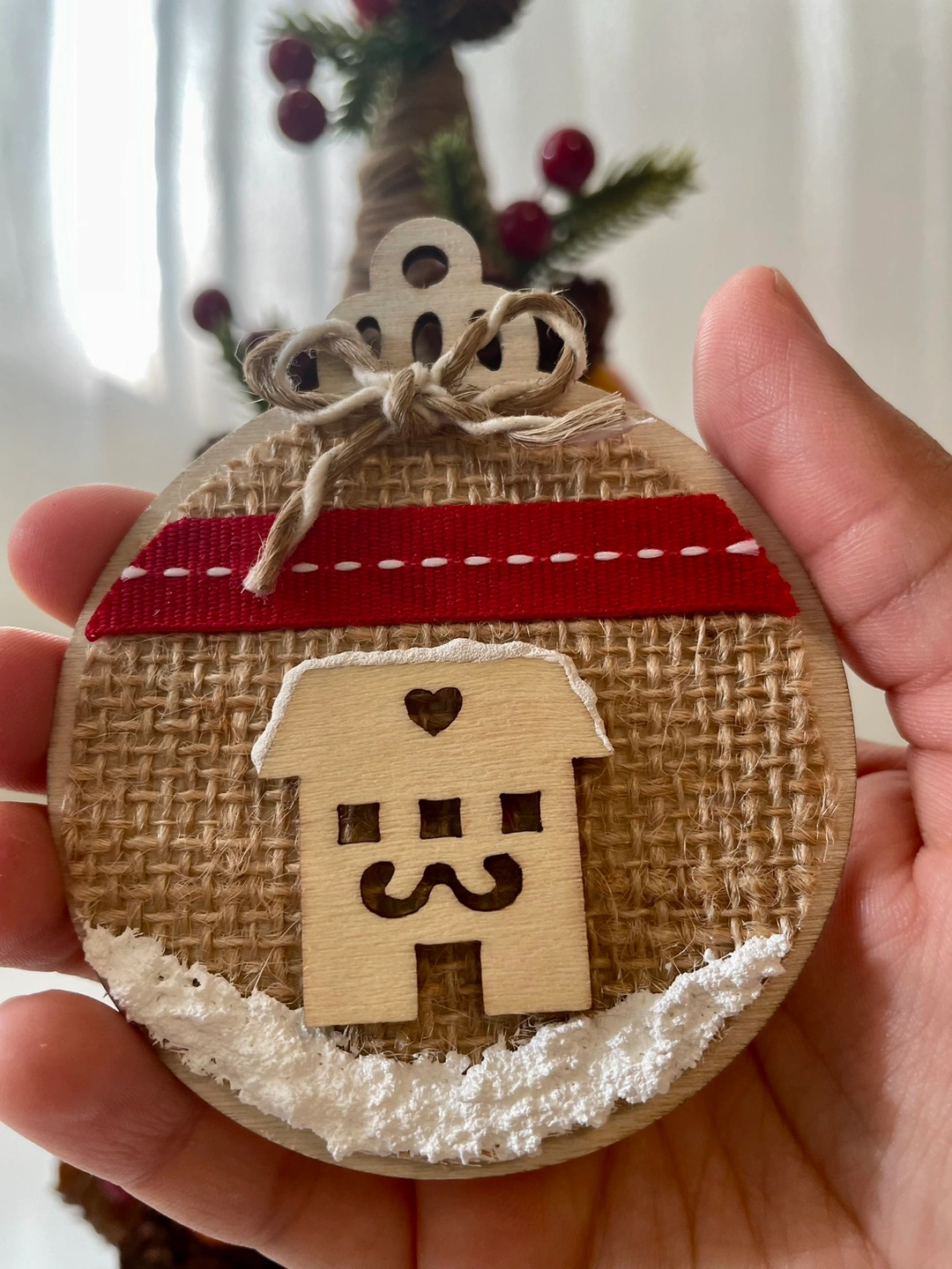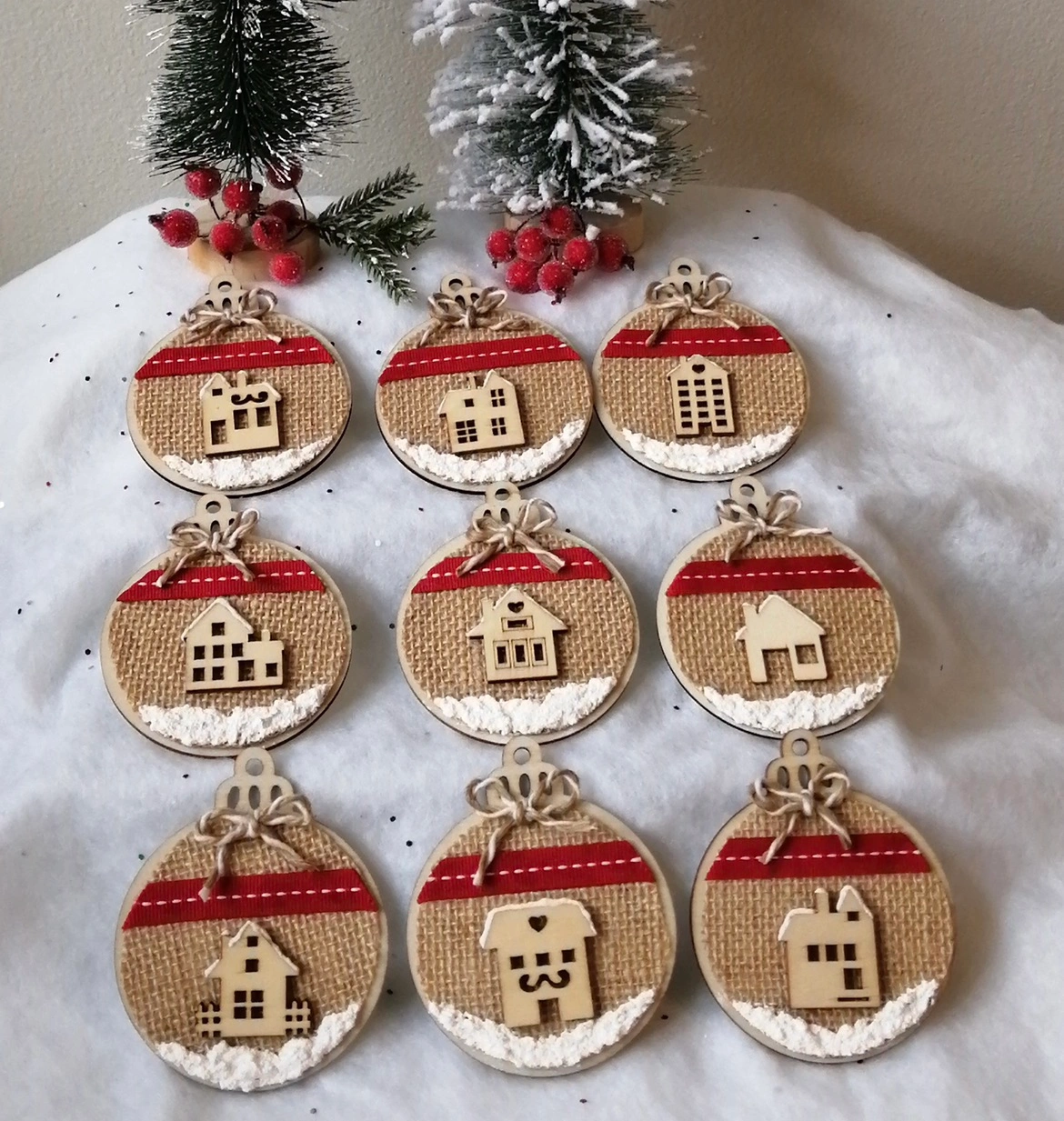 This set of cute Christmas ornaments are handmade by my mom. These are wooden (including decorative houses) and decorated with ribbon, burlap and faux snow