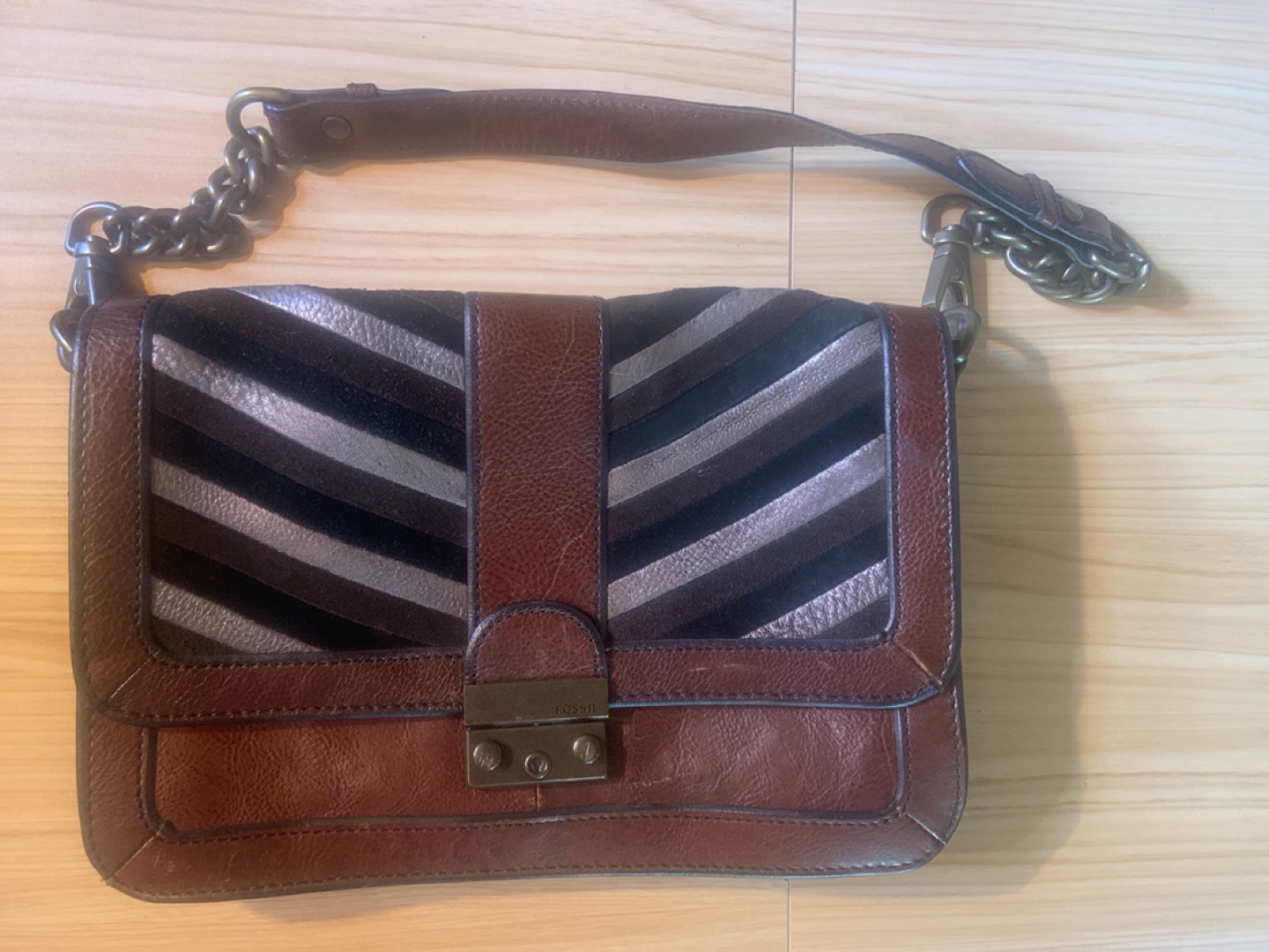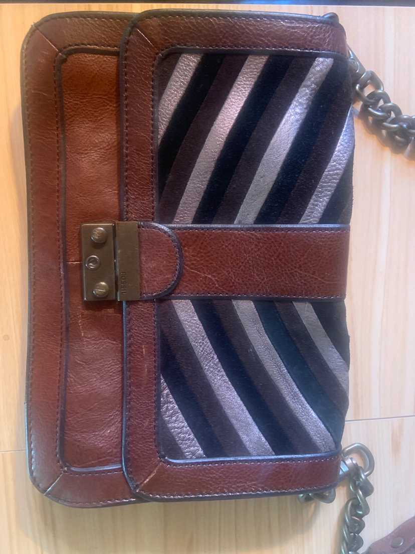 Elegant Fossil bag with Brown black silver stripes and brass buckles, beautiful and chic. gently used. 50 OBO ☺️