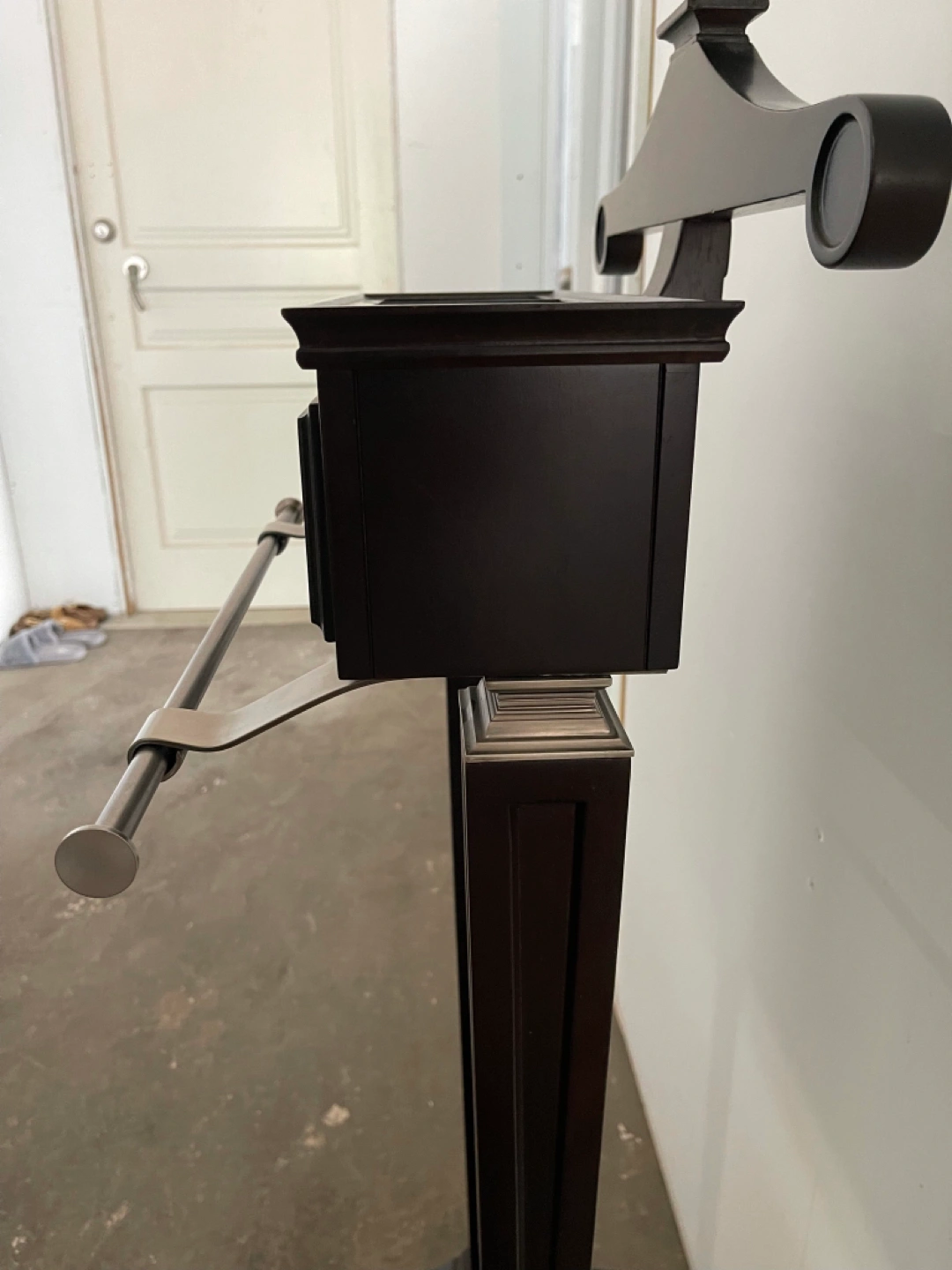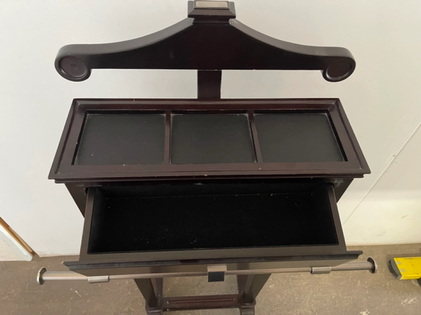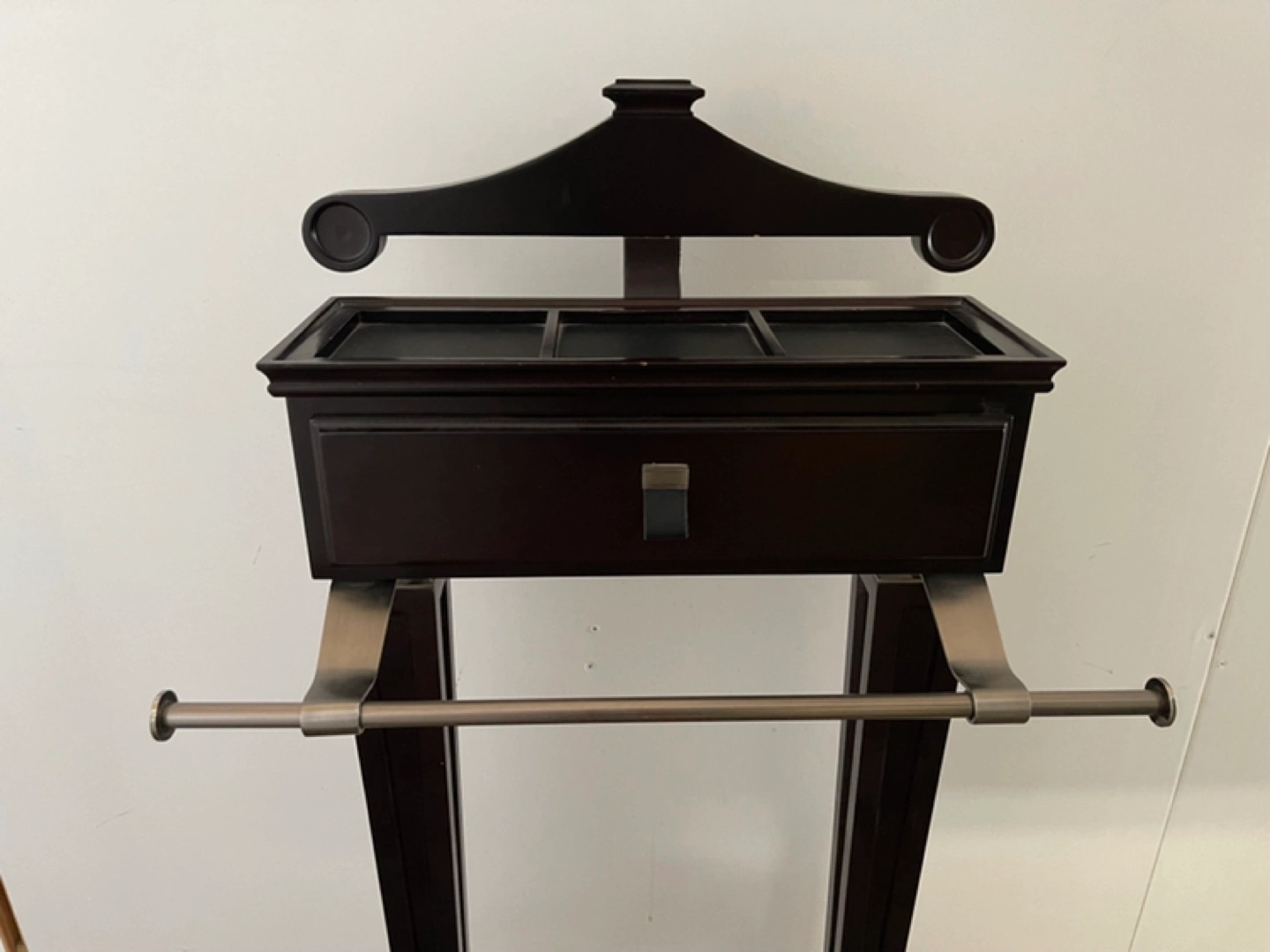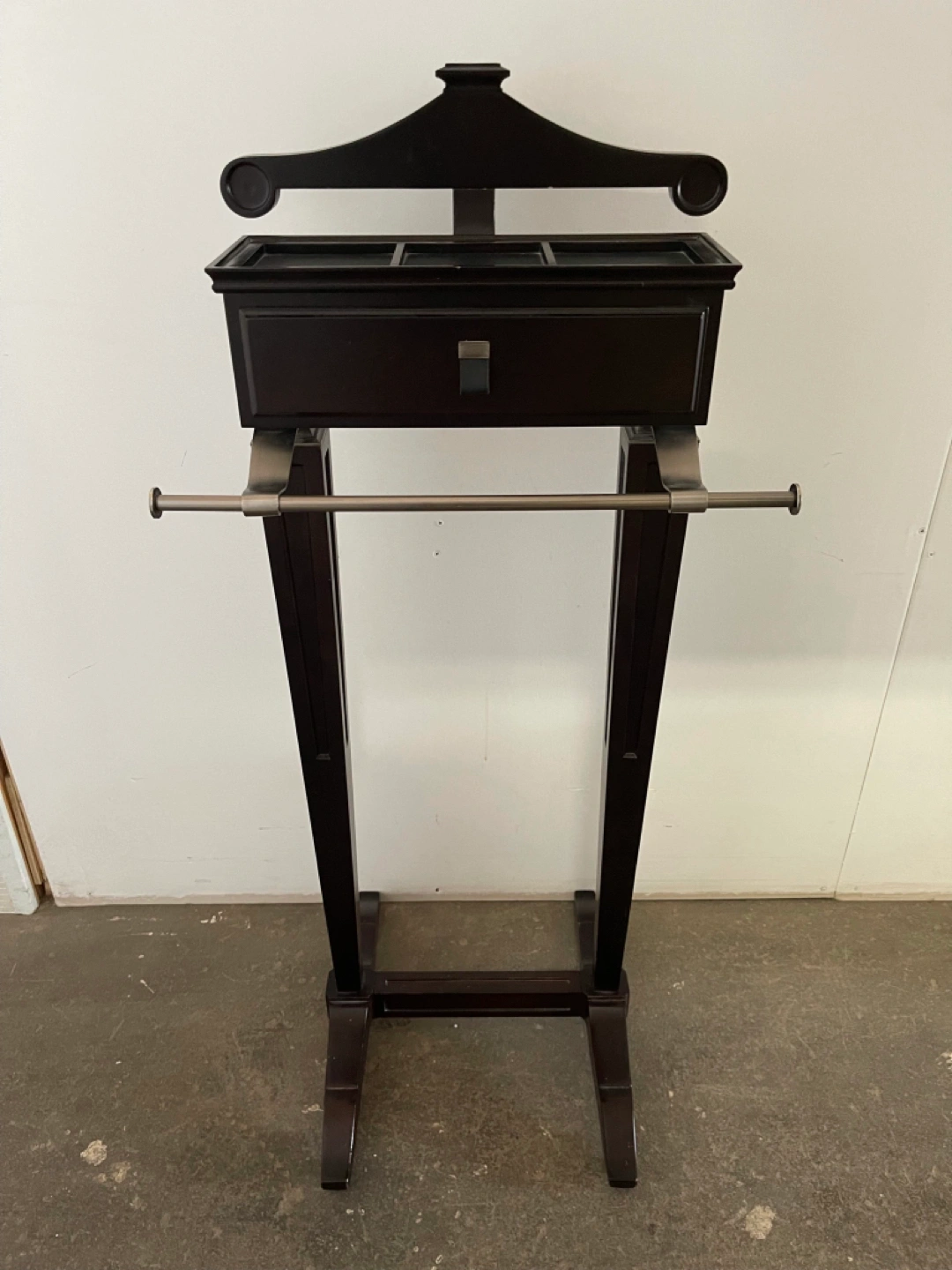 Bombay valet stand will get you organized for busy days. The wood valet is finished in espresso with silver accents. Has a large shelf to place your watch, cellphone, rings, keys or other belongings as well as a pull out drawer to keep items out of sight. There is a rod to hang trousers etc and space to hang jacket or shirt.