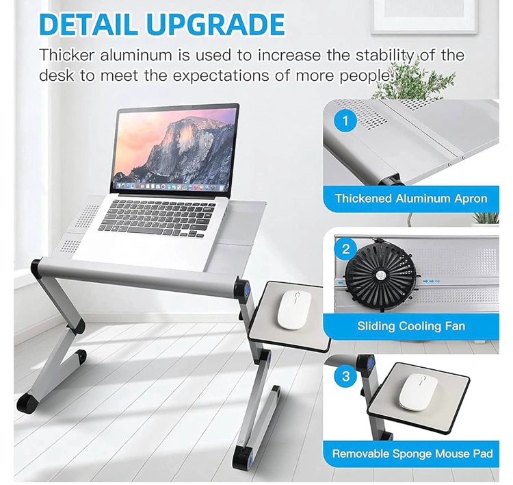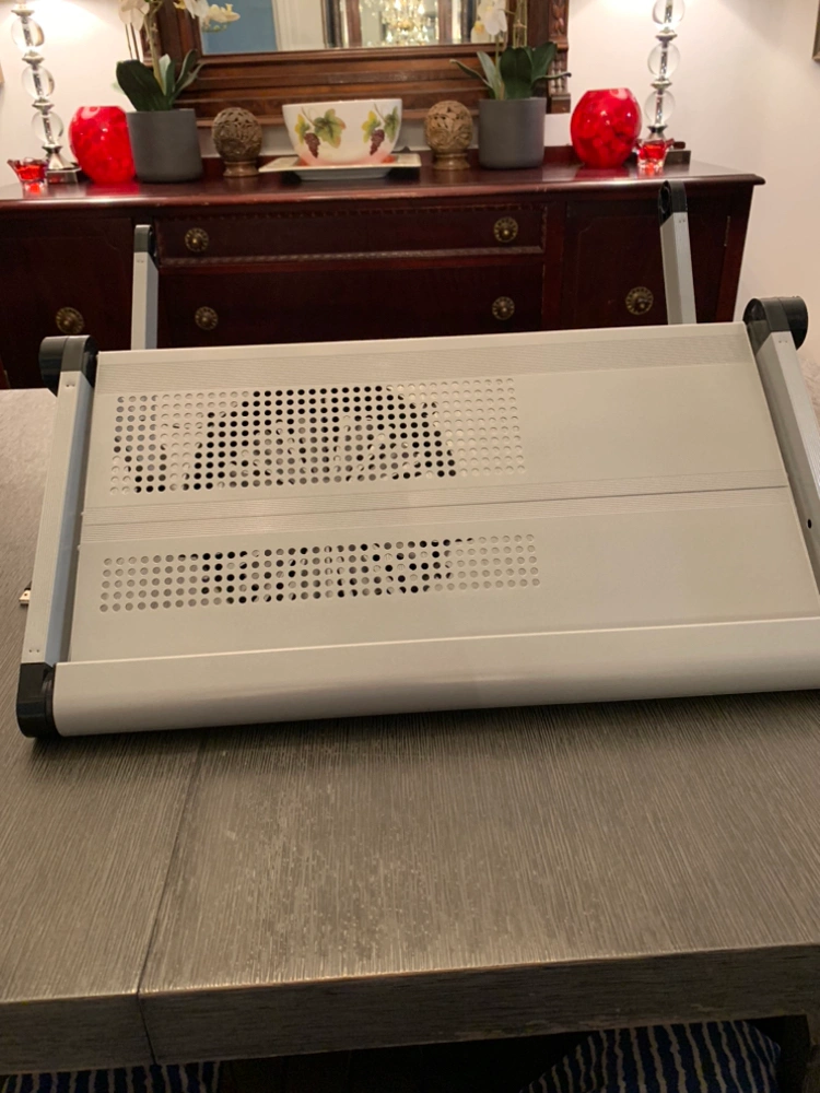 Laptop tray adjusts to a wide variety of positions for various use cases.