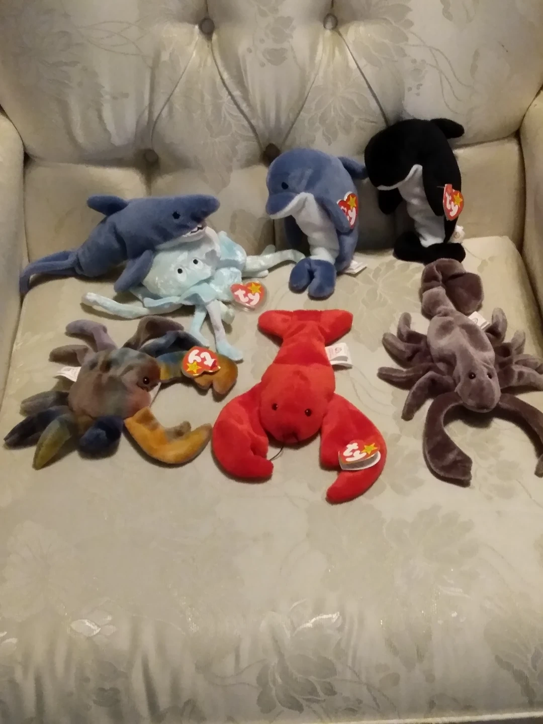 Ty Beanies from the sea group. Each priced separately or all 6 for $95. Pinchers the lobster$50, (Claud the crab$30 SOLD), Stinger the scorpion$15, Crunch shark$15, (Echo dolphin$30 SOLD) Goochy jelly fish$15 and Waves the whale$25