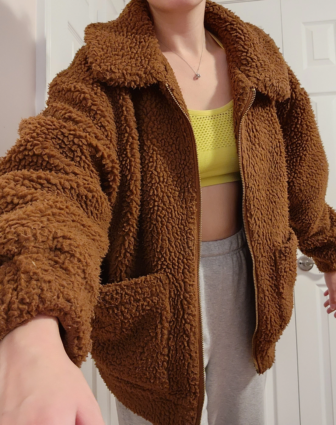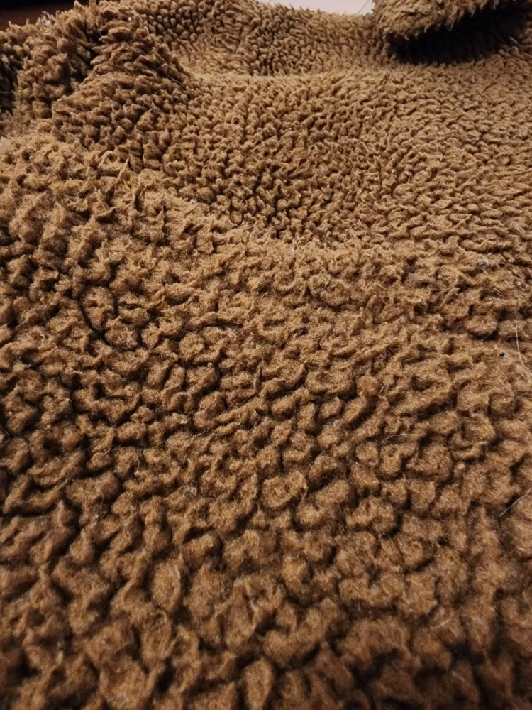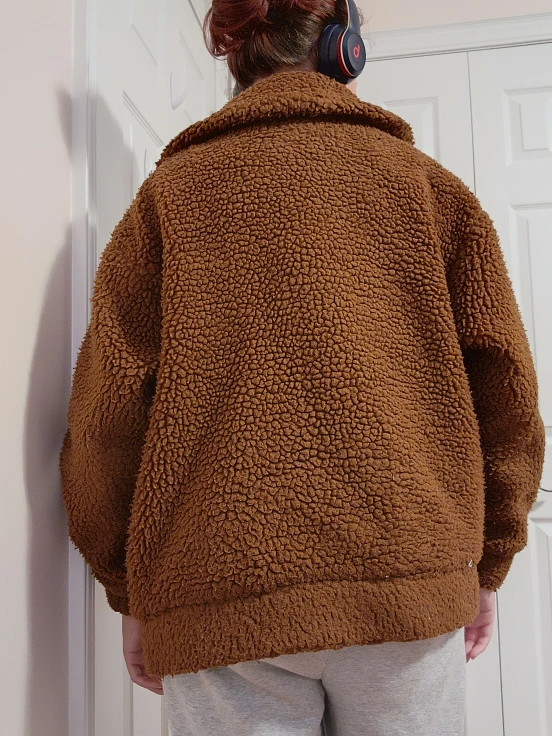A brown faux fur sherpa jacket from Garage®. Super comfy with elastic bands at the wrist and waist, and 2 large top-opening pockets.