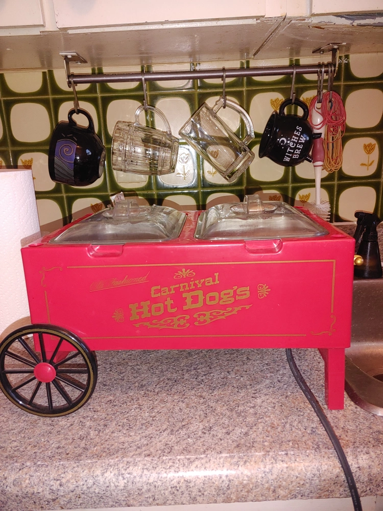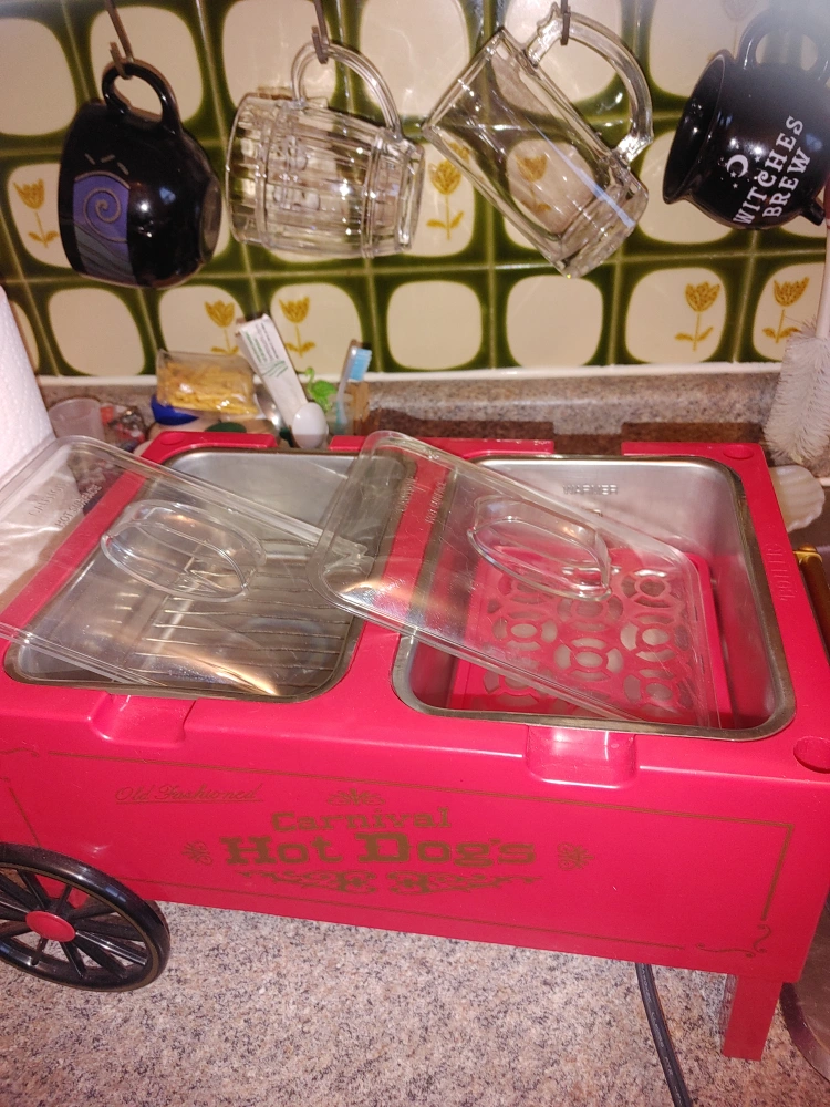 Two steaming trays for hot dogs and buns. (10 min for hot dogs, five for the buns) Plug in. Should have a little canopy to look like the circus or zoo but the columns are missing. Will provide canopy in case you have an alternative.