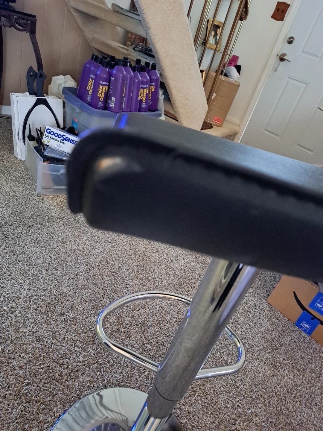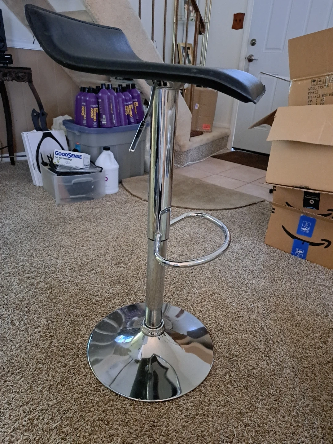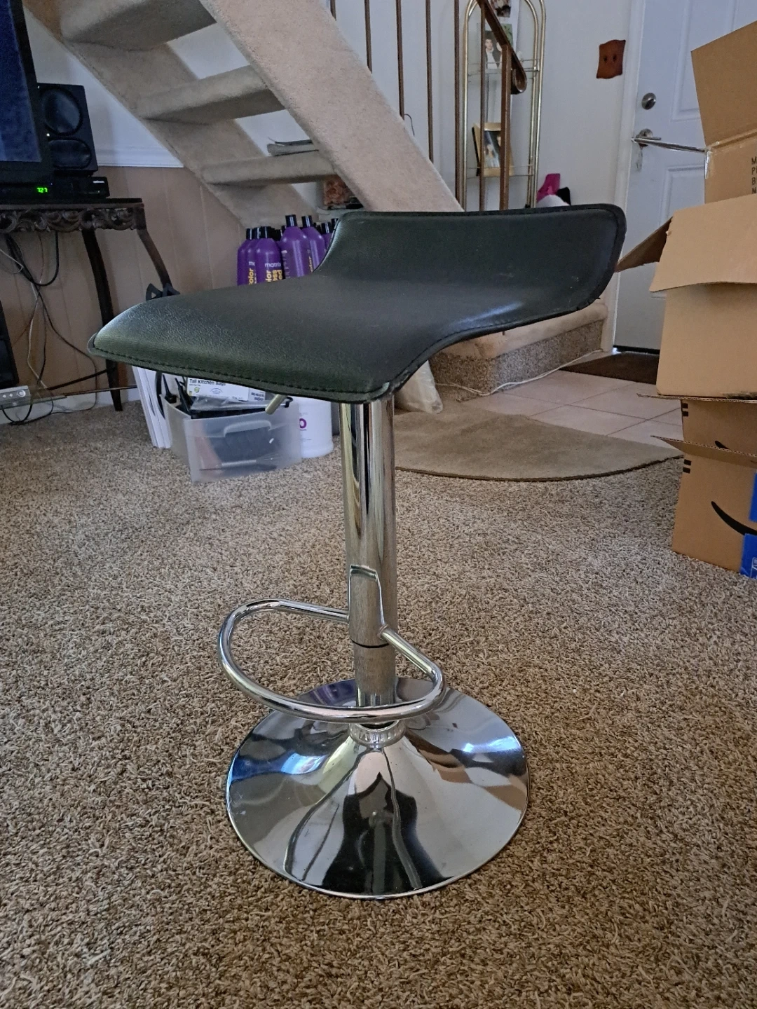This is an adjustable bar stool with a black seat and a chrome base. It's designed for comfort and style. The height is adjustable to suit your needs. Has little tear on back sides shown in picture