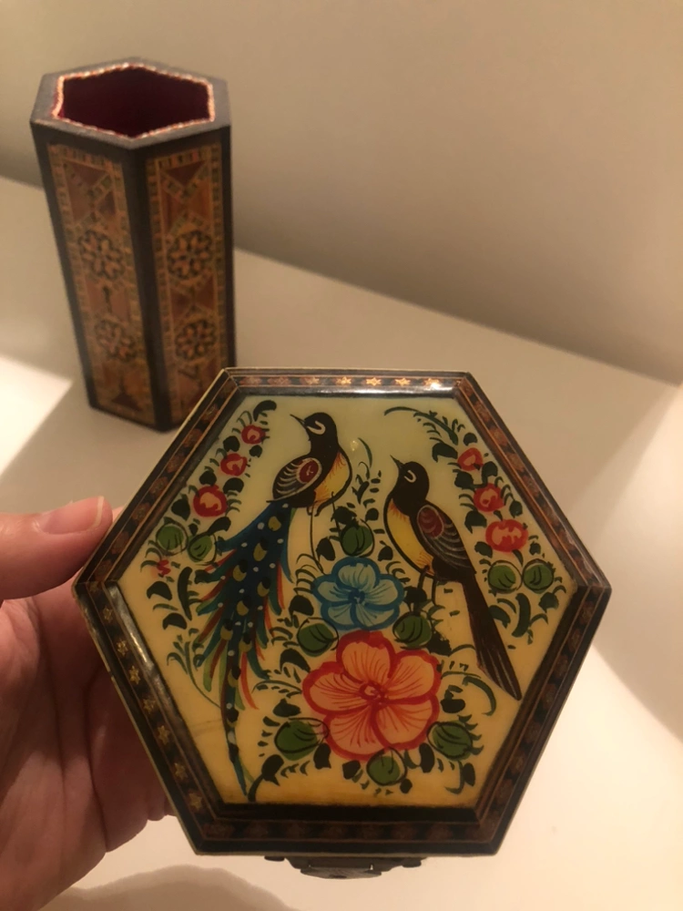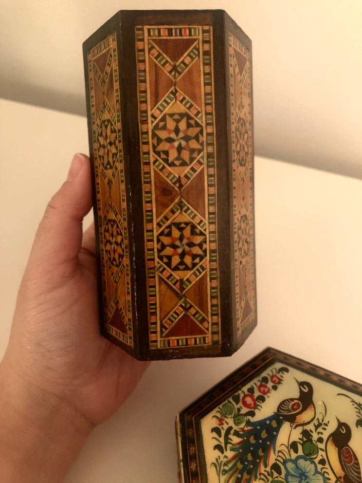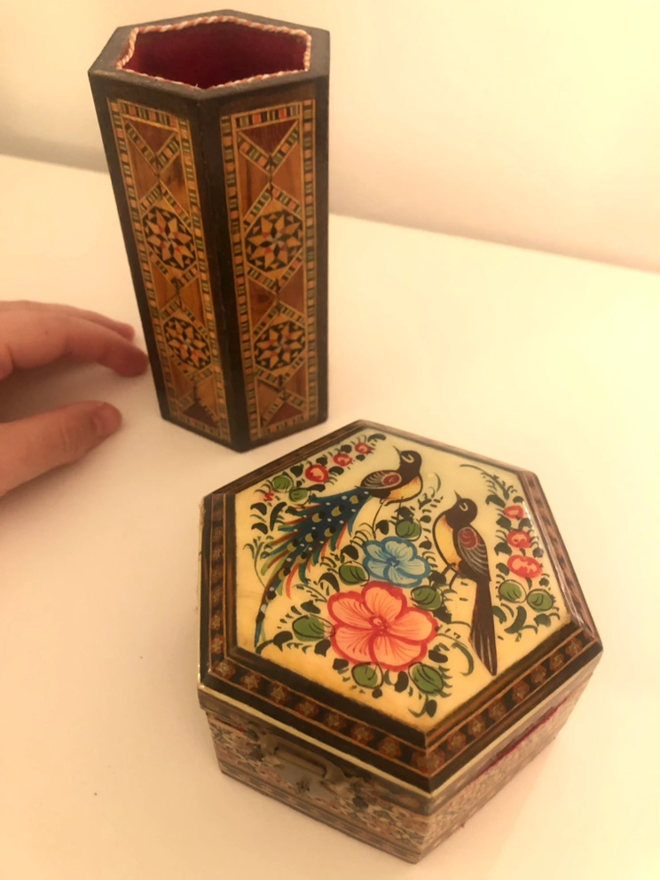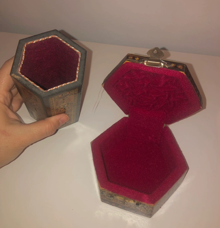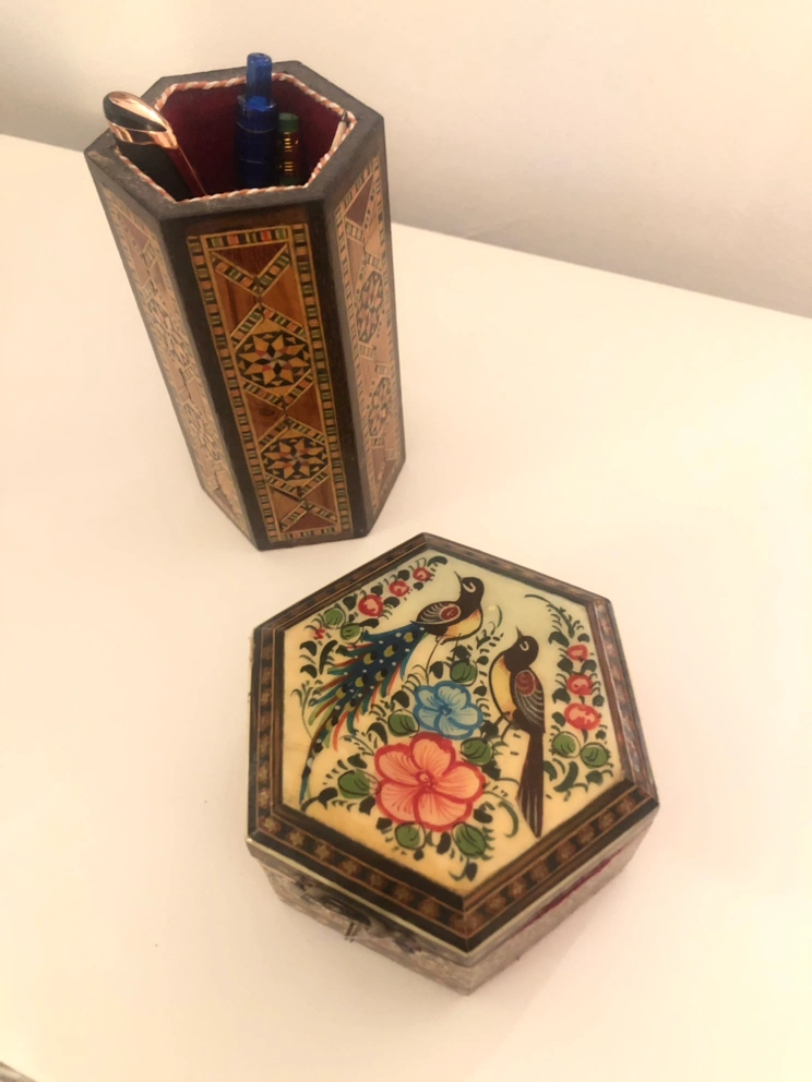 Handmade pen holder and jewelry box from Syria. Exterior covered with patterns made out of wood, and interior finished with red velvet fabric.