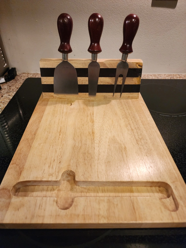 Solid wood cheeseboard with a magnetic knife holder on back. Knife set is incomplete. Otherwise, in good shape.