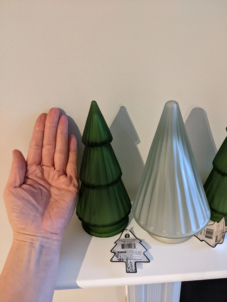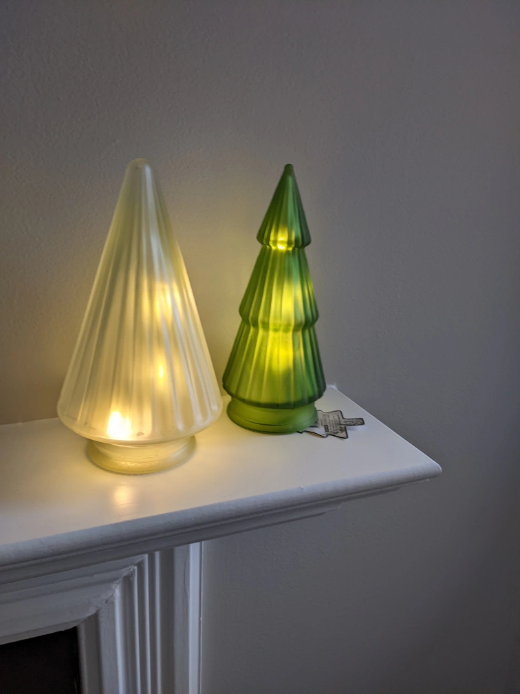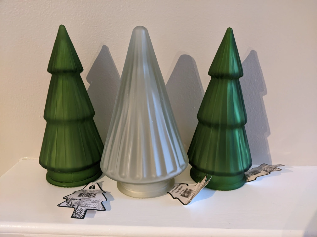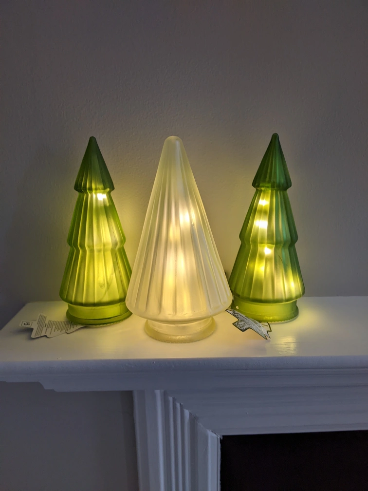 $3 per tree, 1 green and 2 white available. Frosted glass with led lights inside, uses button batteries, included and unused. I bought a whole box but only needed half. pick up either St.george station, Ajax GO or Markham Steeles and Warden