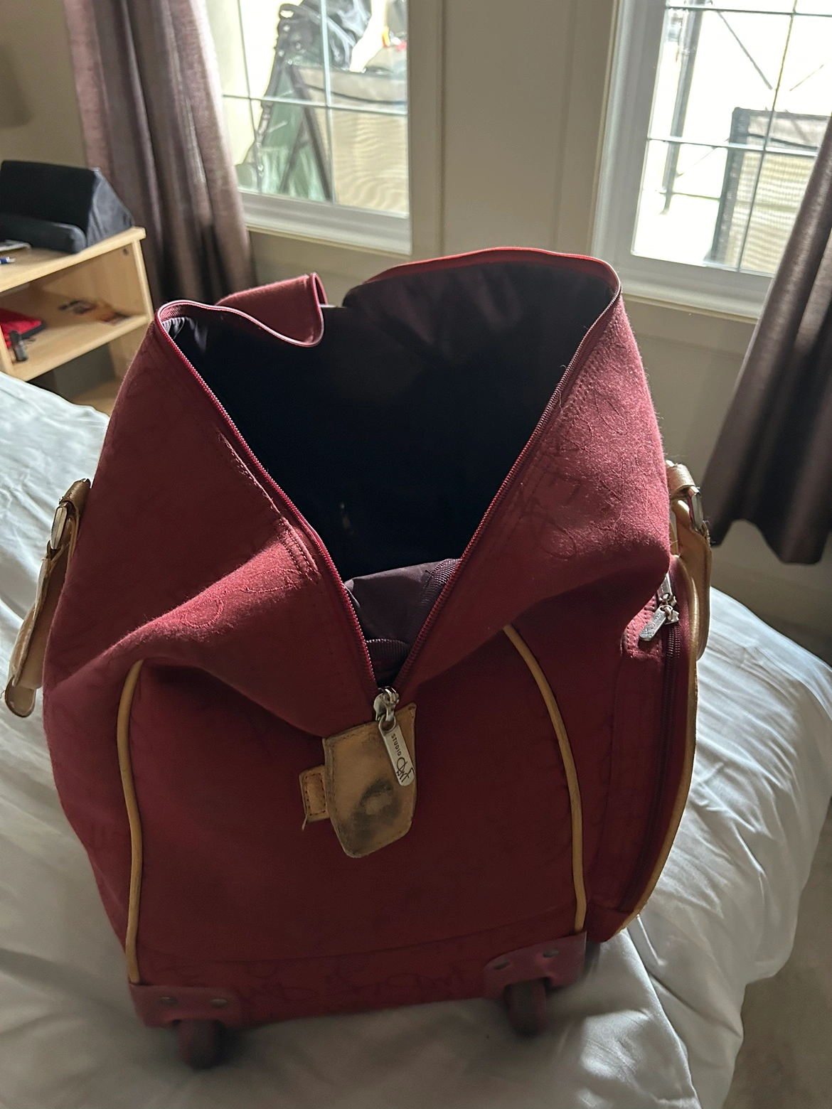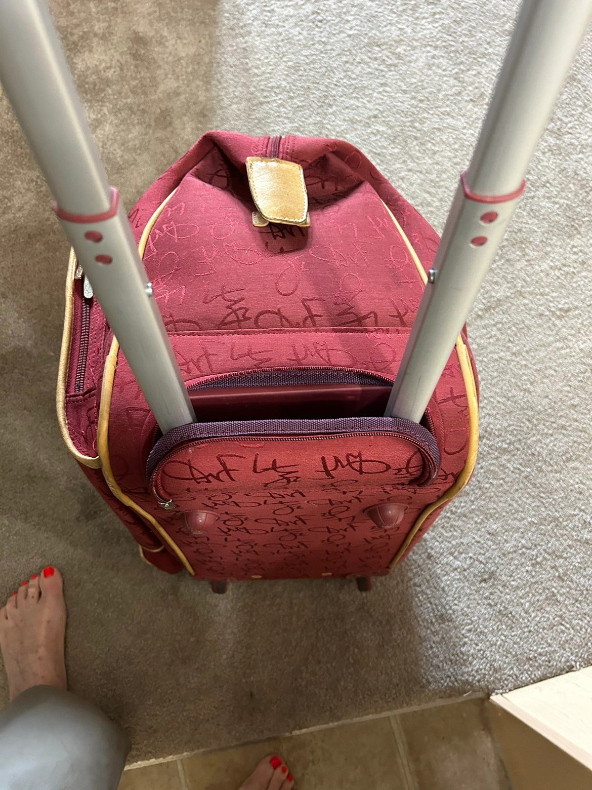 Used in good condition. Maroon colour fabric. Zipper to cover handle is broken but does not affect use,