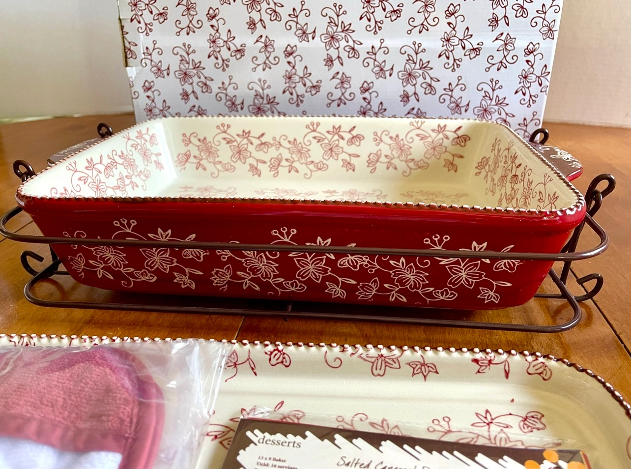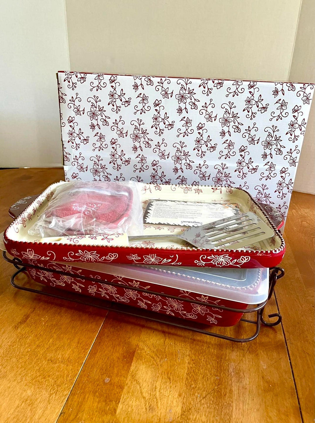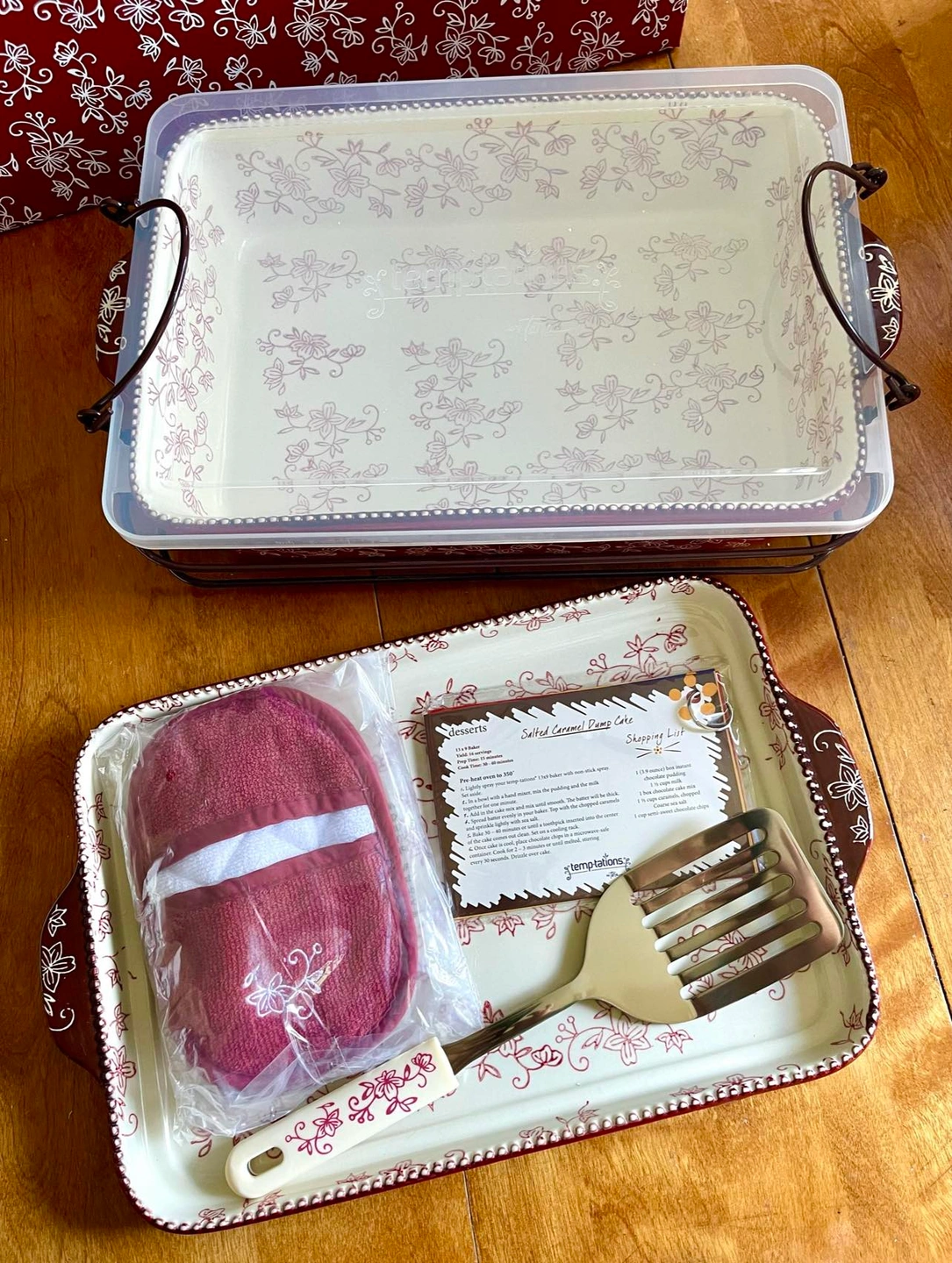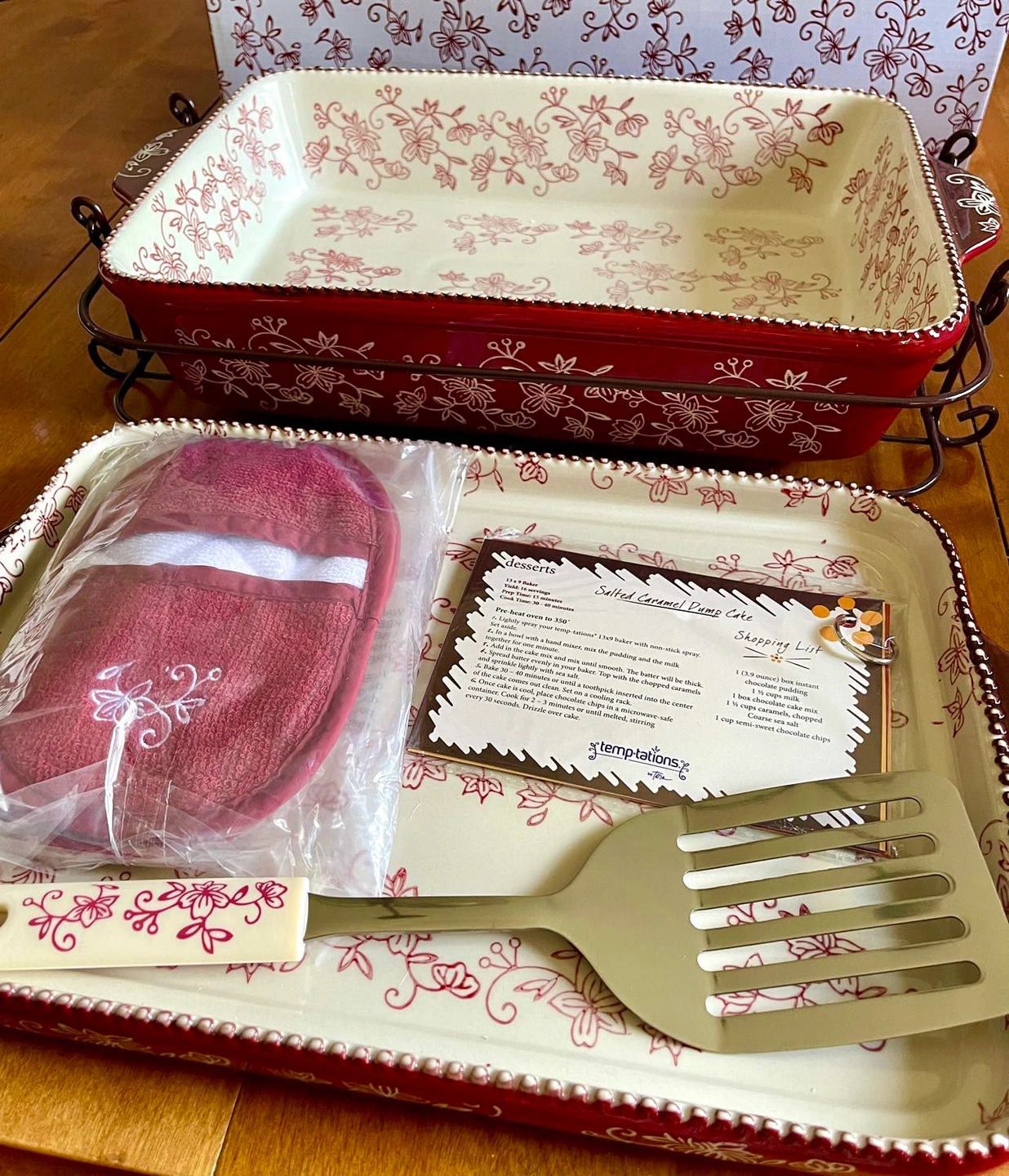 7 piece set: 9x13 baking dish, cookie sheet, serving utensil, oven mitts, storage lid, trivet/carrier, recipe cards.