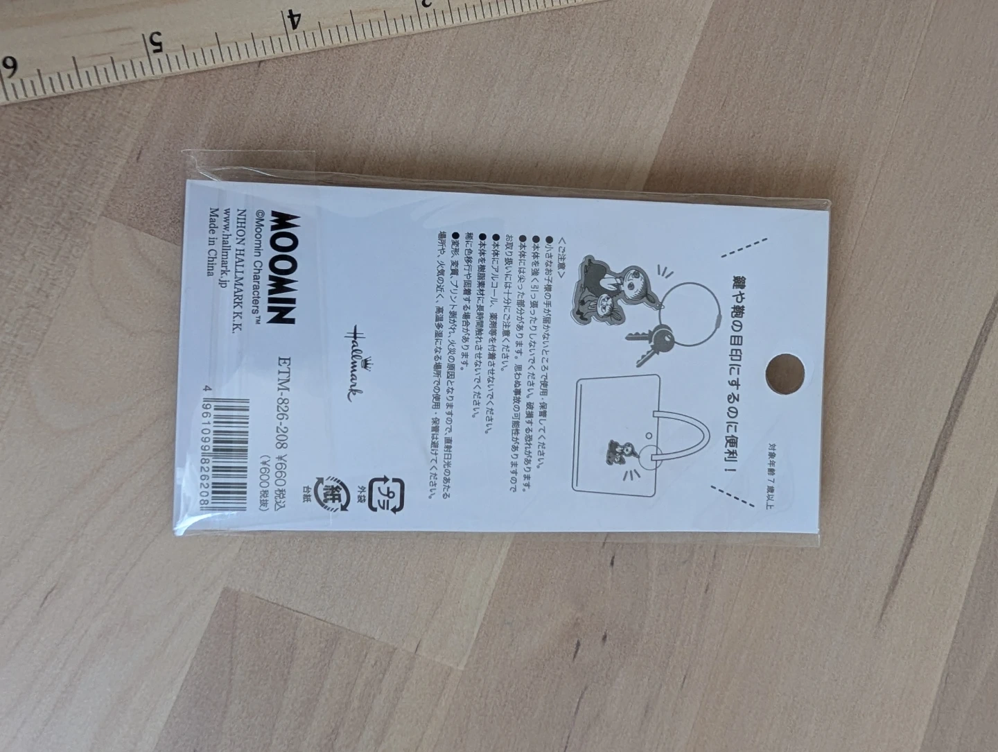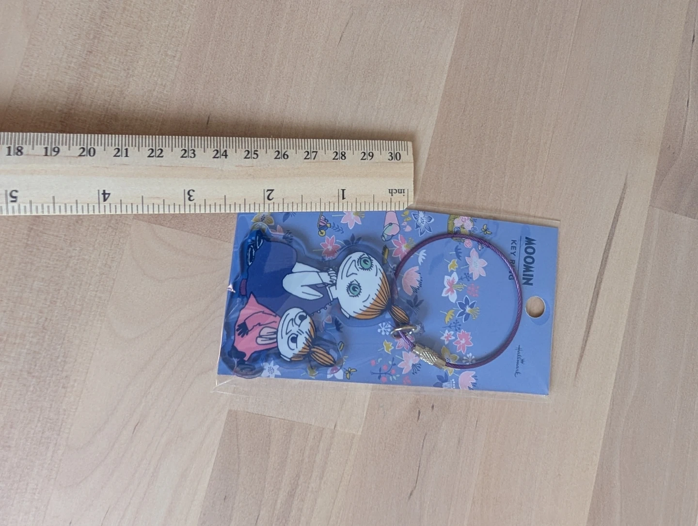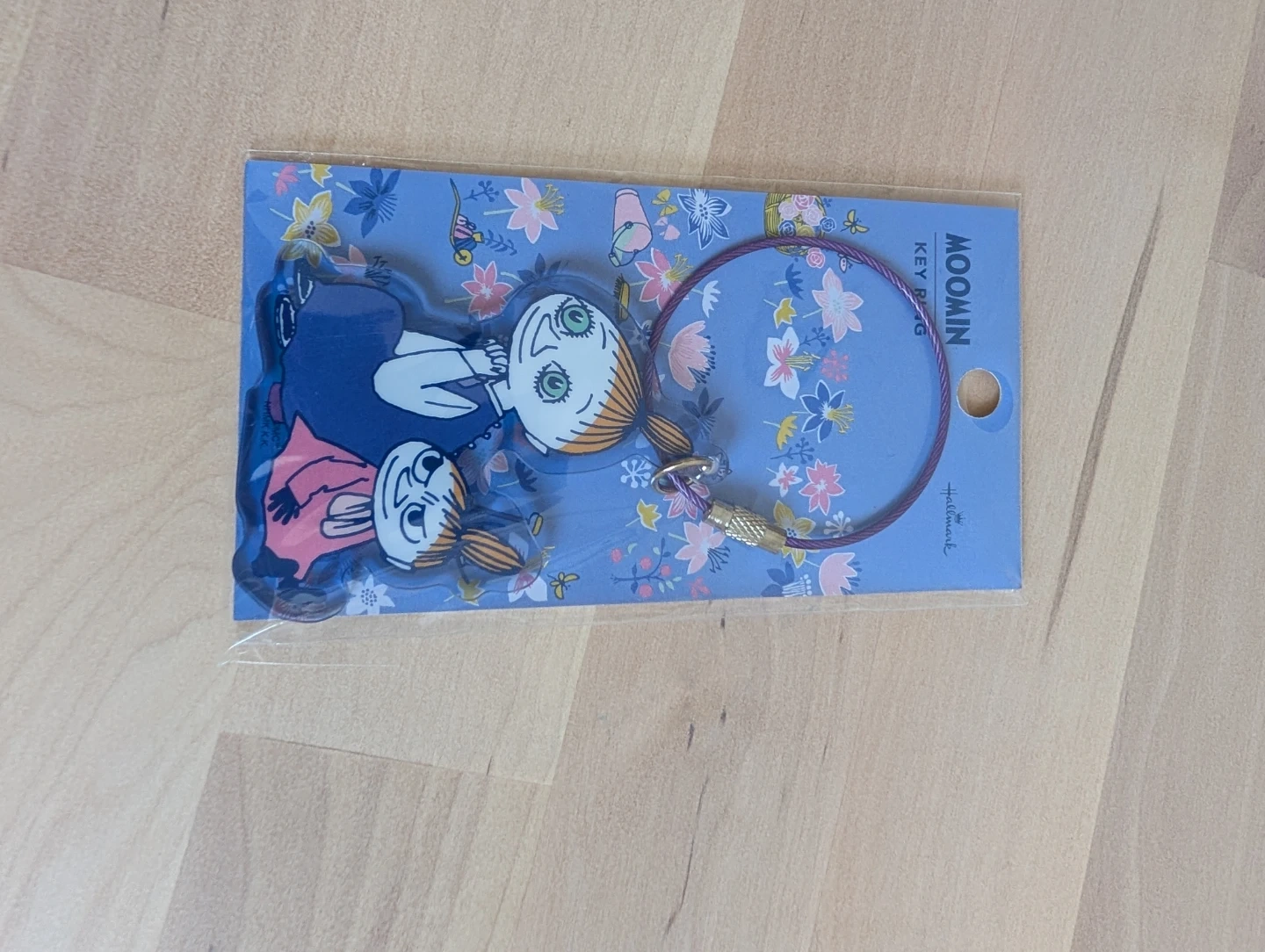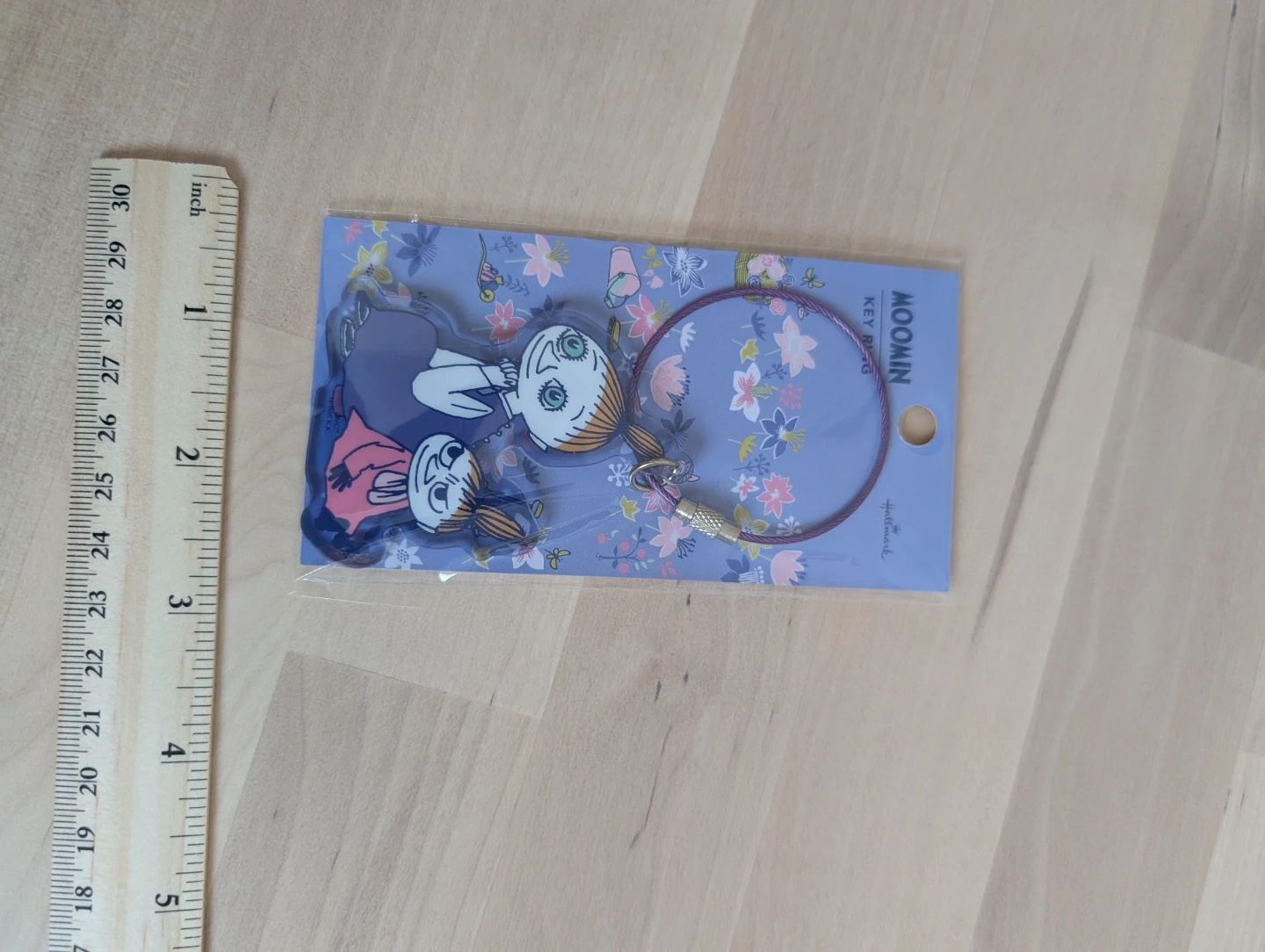 A Moomin characters keychain featuring Moomintroll and Snorkmaiden. Made by Hallmark. Includes a sturdy metal ring for attaching keys.