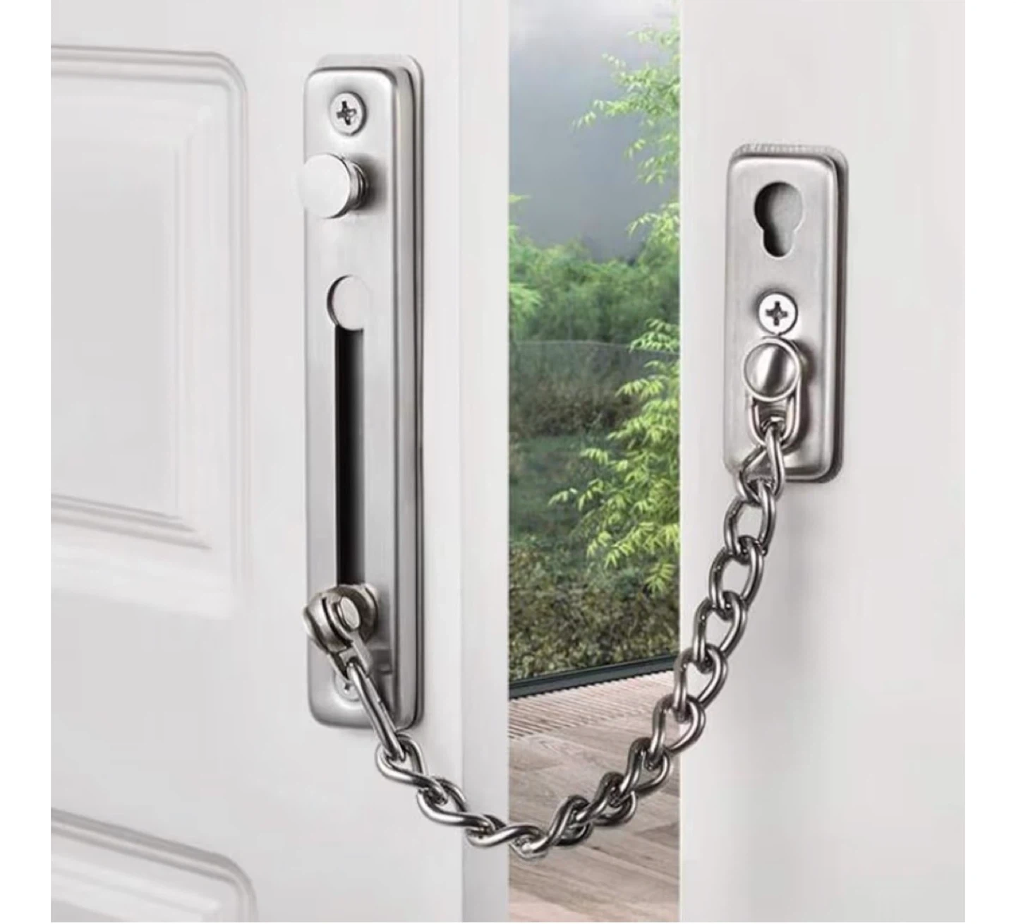 The chain door guard with spring snaps can be unlocked by pressing the spring button. Install the door latch at a higher position on the door to prevent children from reaching it to protect their safety. It cannot be unlocked from the outside to ensure your safety.
