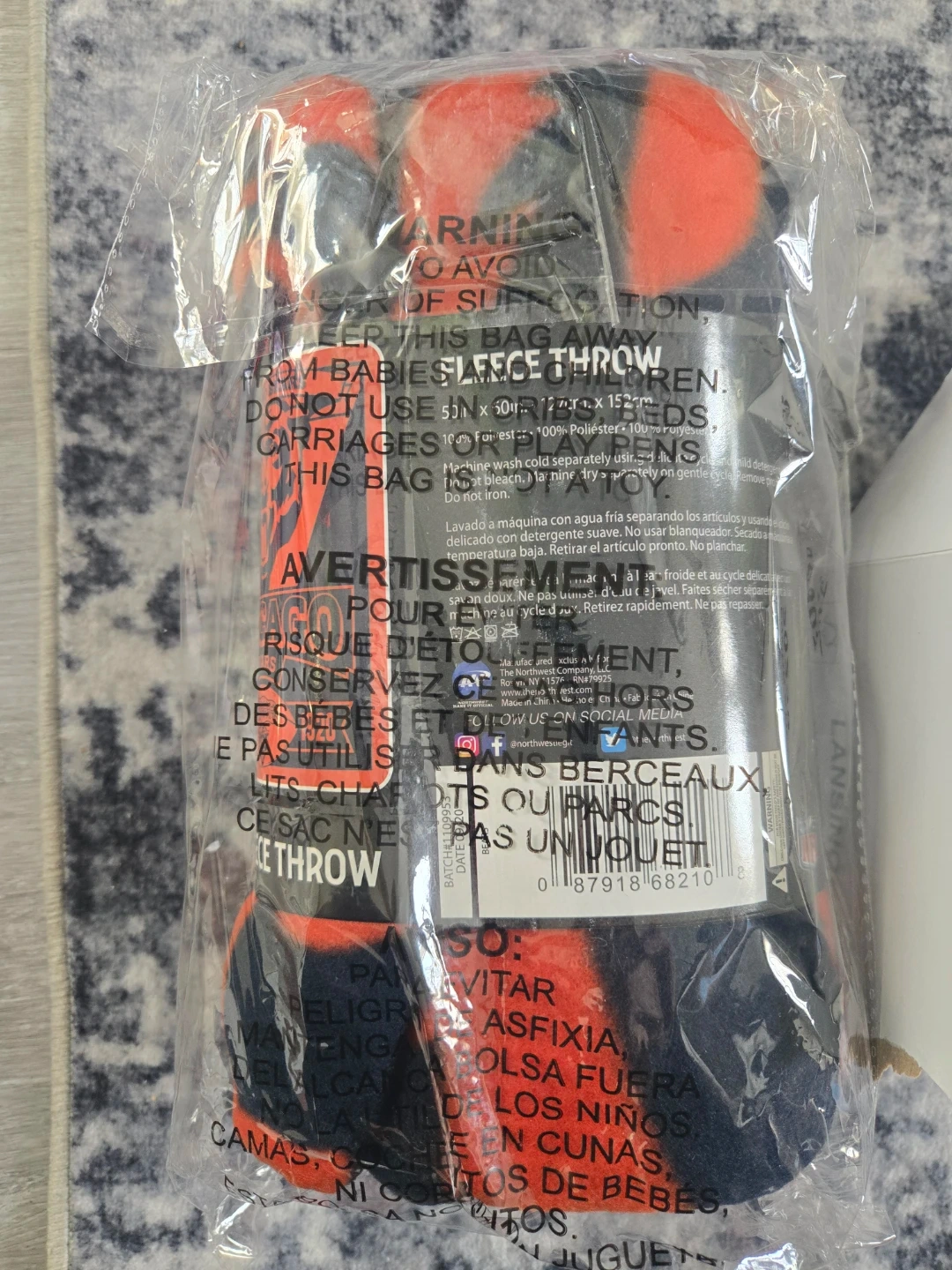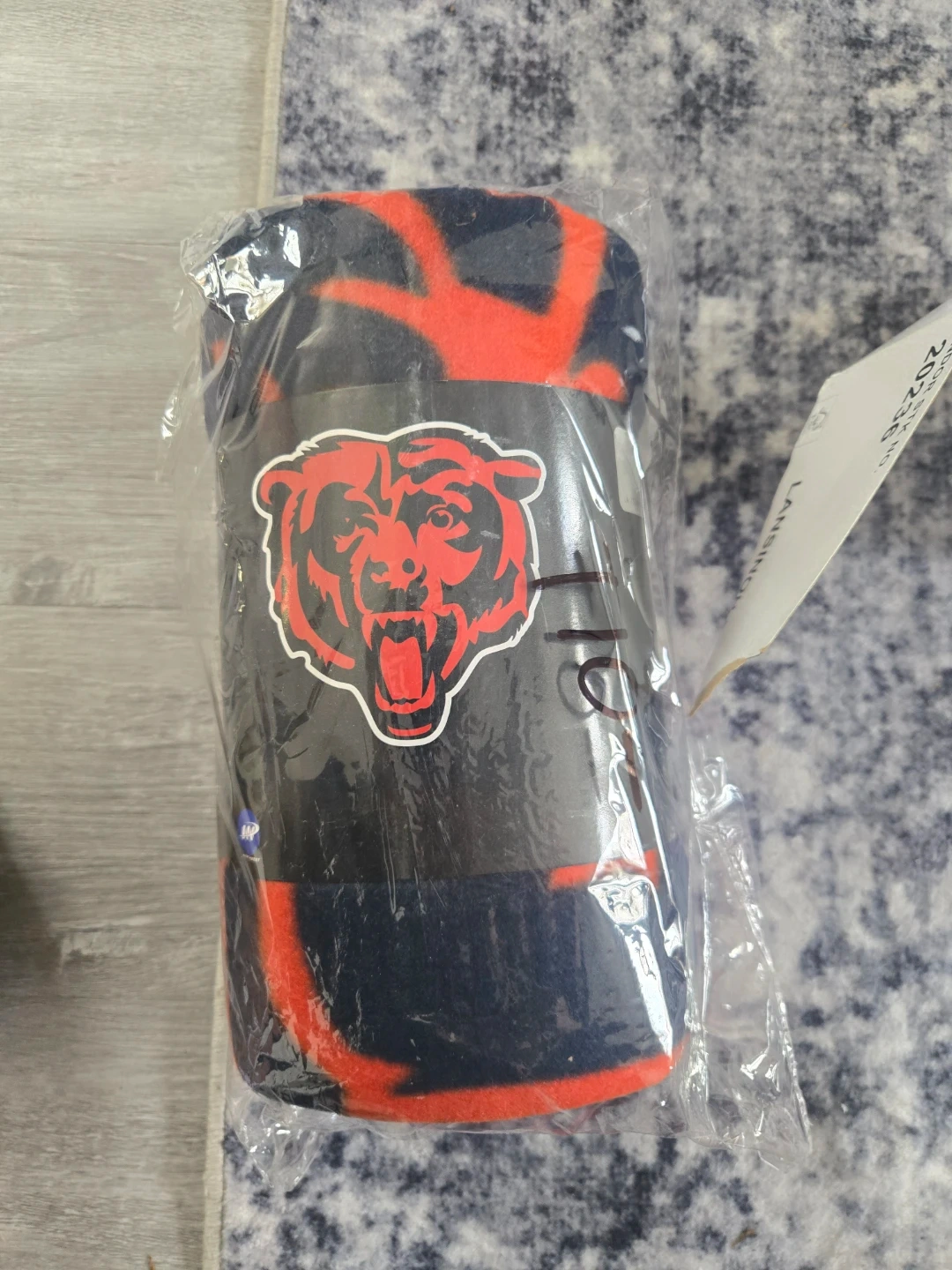 This is a Chicago Bears themed fleece throw blanket. It's made from 100% polyester fleece. Size is 50" x 60".