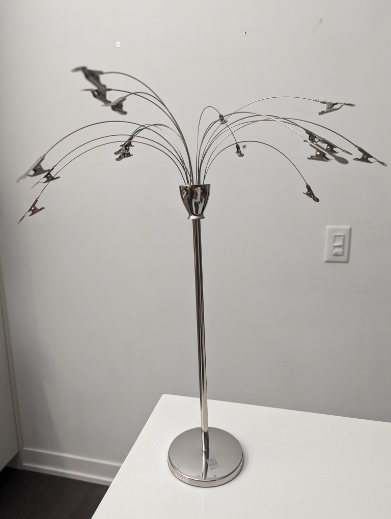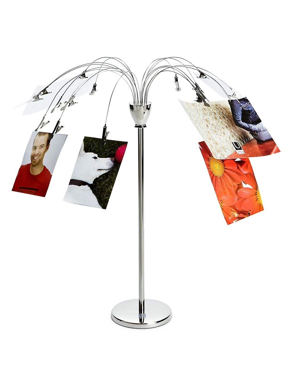 An alternative to the typical photo frame, Fotofalls allows your photos to be displayed in a collection, all stemming from one tabletop stand. The photos are dispersed 360 degrees thanks to Fotofalls umbrella shape. Freestanding desktop photo tree holds 18 photos/notes on clips.