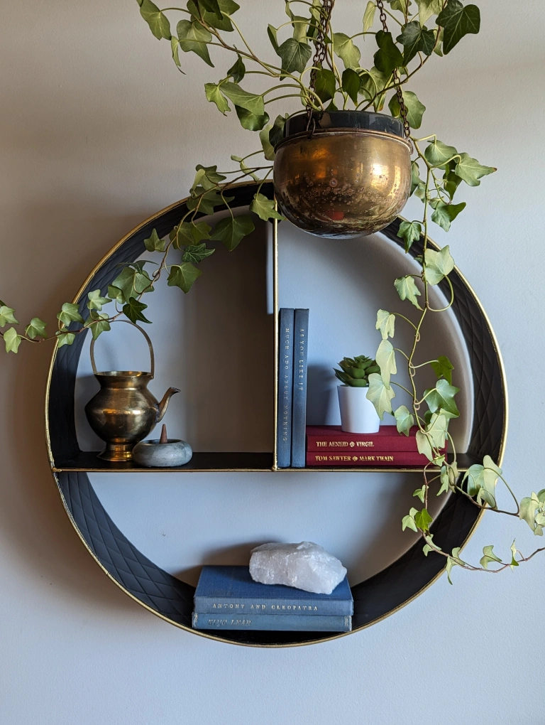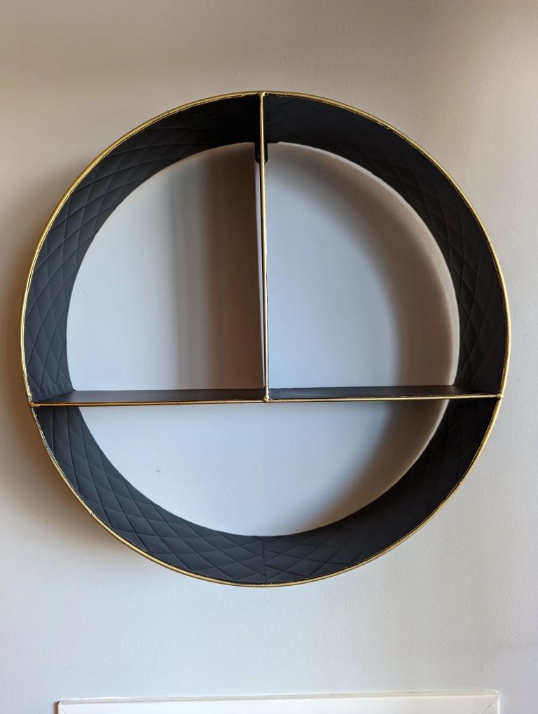 This black and gold circular shelf is great for displaying small items in your home. Add a piece of elegant style to your wall with this shelf.