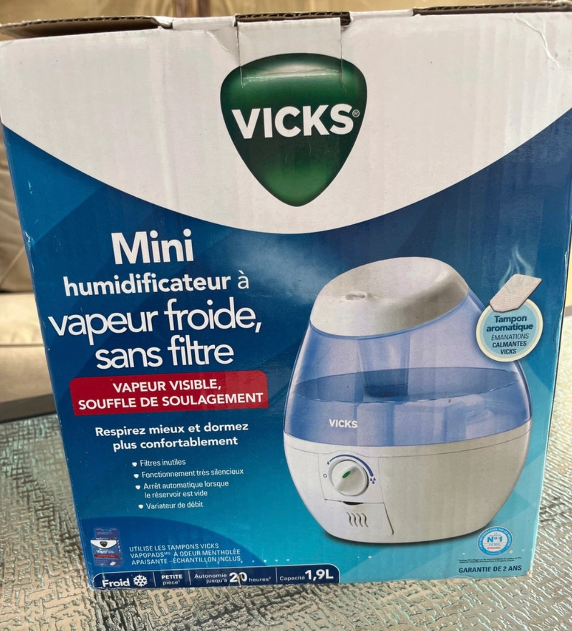 - Scent pad slot for use with Vicks VapoPads for a soothing scent - Translucent tank with wide opening for easy filling and cleaning - Variable output settings to allow you to set output at any level - Auto shut off when empty - Runs up to 20 hours per filling - 1.9 litres (0.5 gallon) capacity