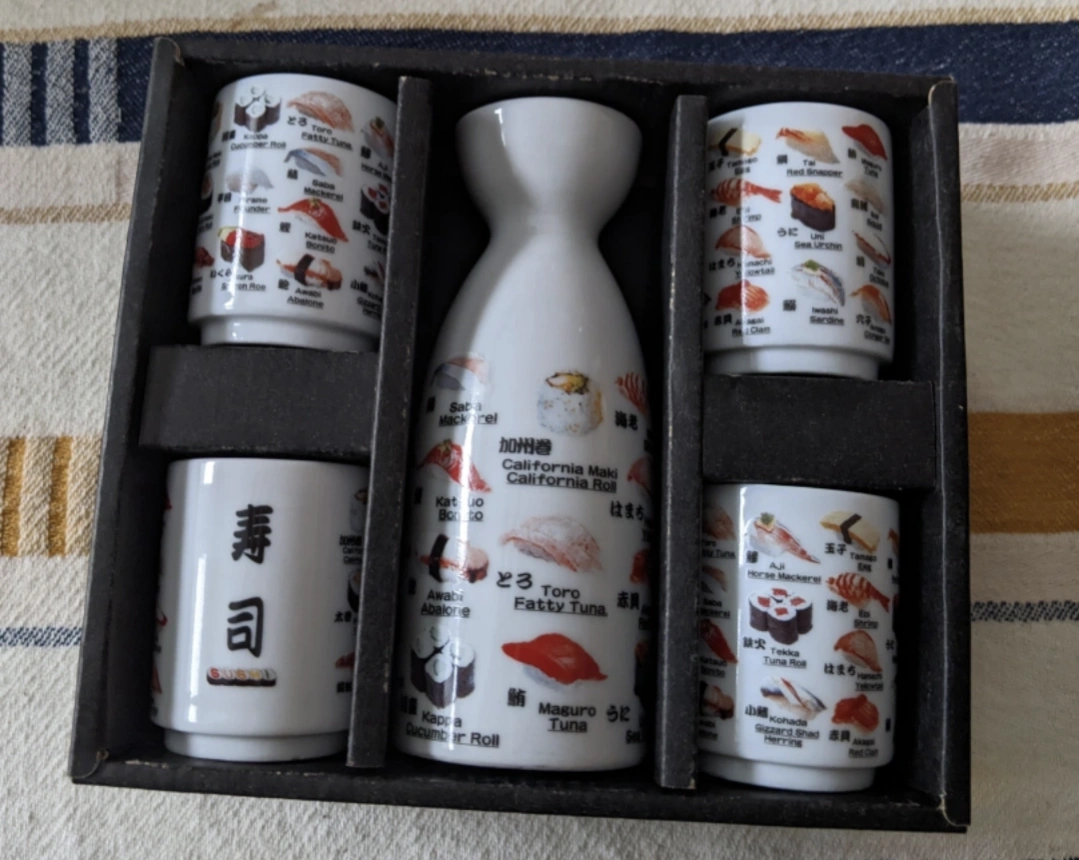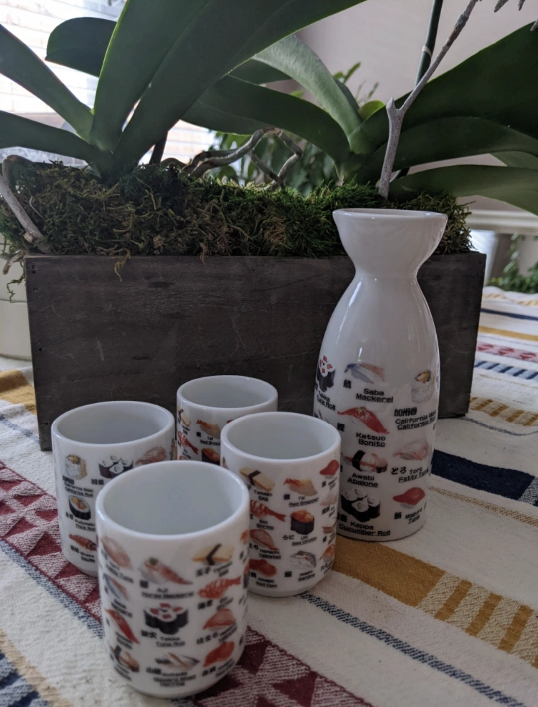 Vintage porcelain sake Set for 4 with rare sushi pattern graphics never used Great Christmas gift for the sake lovers pick up in Etobicoke or the financial district