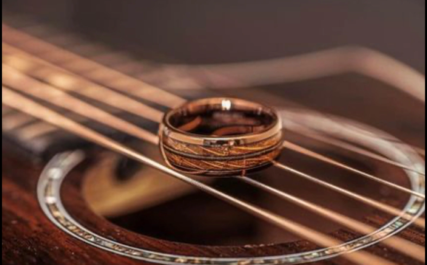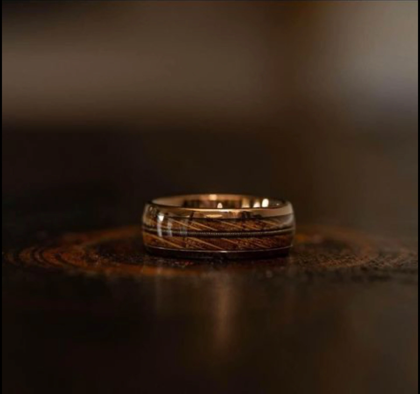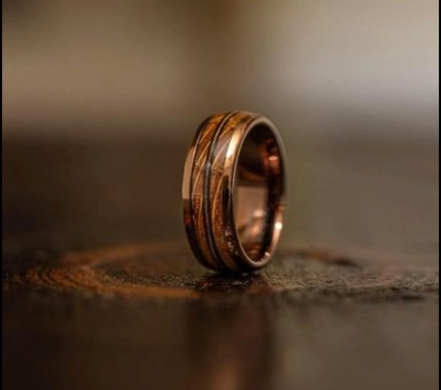 This ring is made out of tungsten carbide shell, dipped in 18k rose gold, guitar string, recycled whiskey barrel wood strip in antiqued rosewood box. originally was $479.16. Nothing wrong with it.