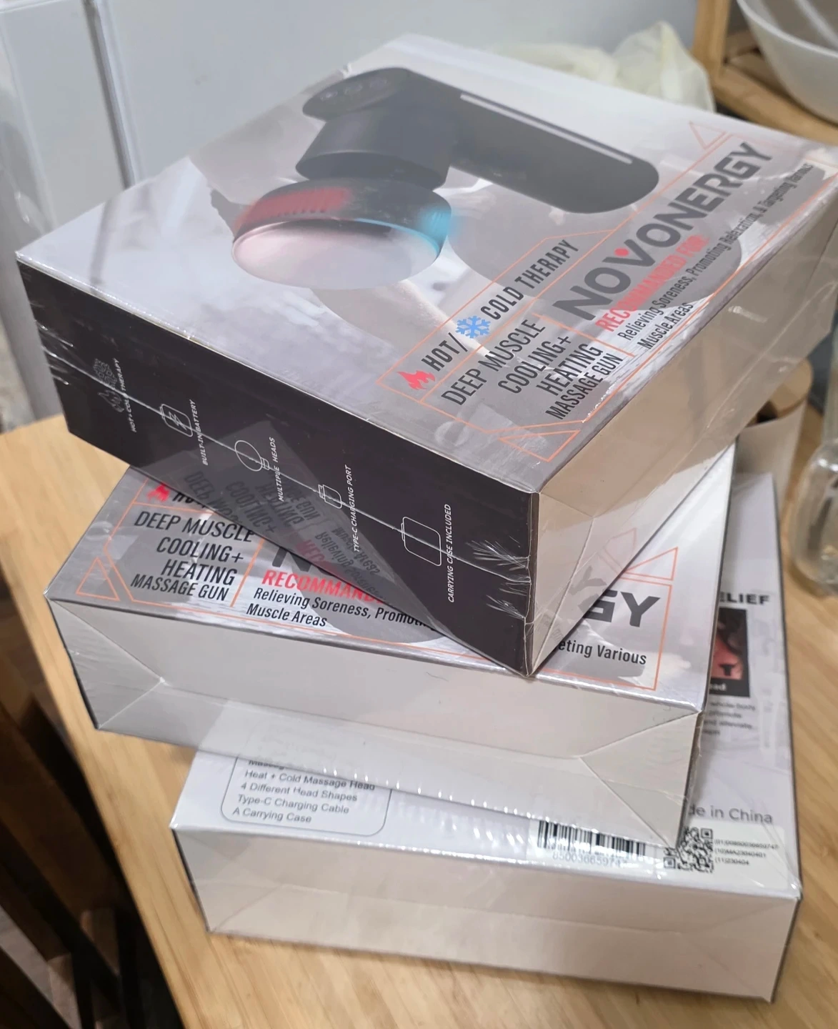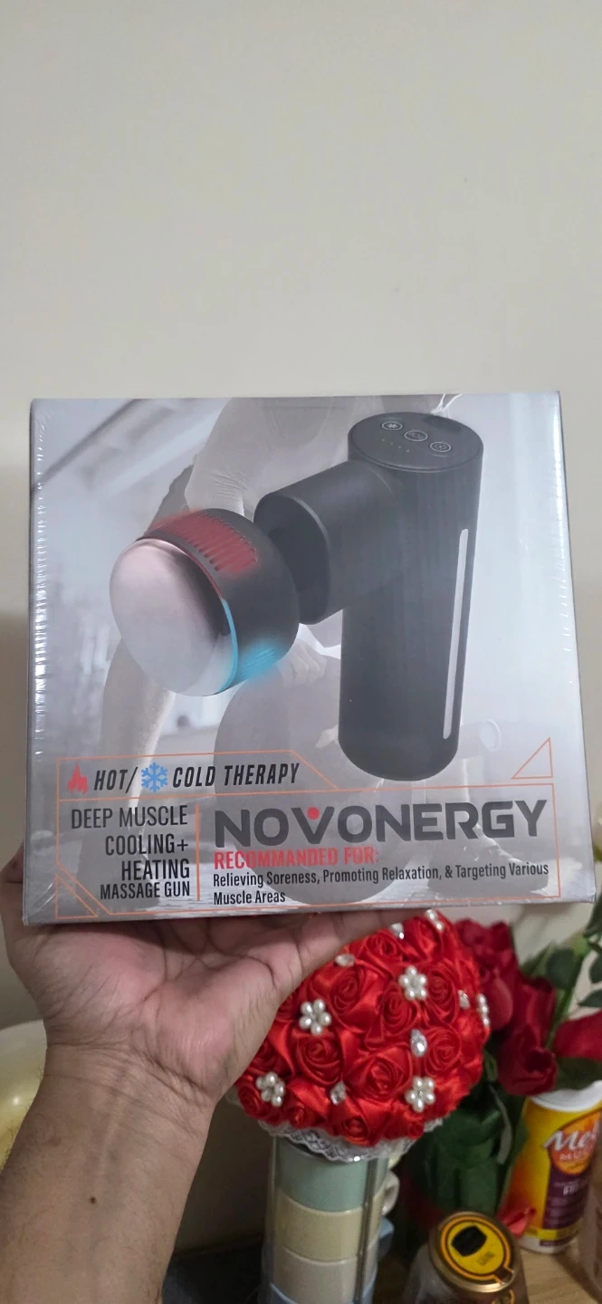 Bran new NOVONERGY massage gun with hot and cold therapy. It's designed for deep muscle cooling and heating. Includes 4 heads, charging cable, and carrying case..