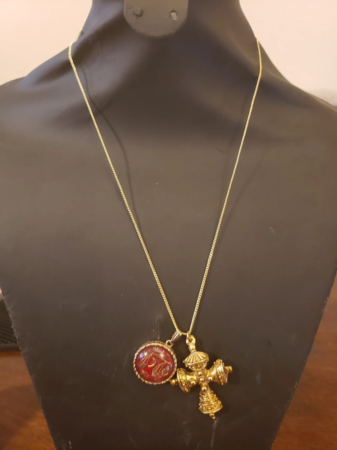 This necklace features a gold-tone chain with a decorative cross pendant and a round red charm displaying a zodiac symbol. It's a unique accessory.