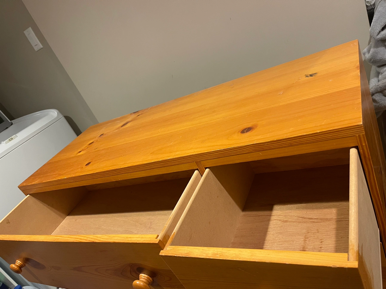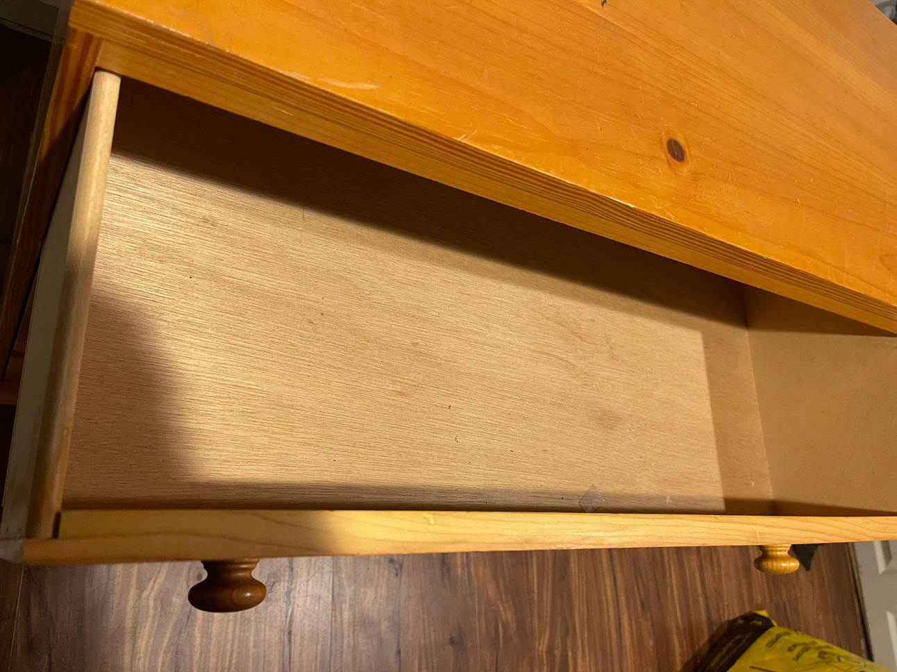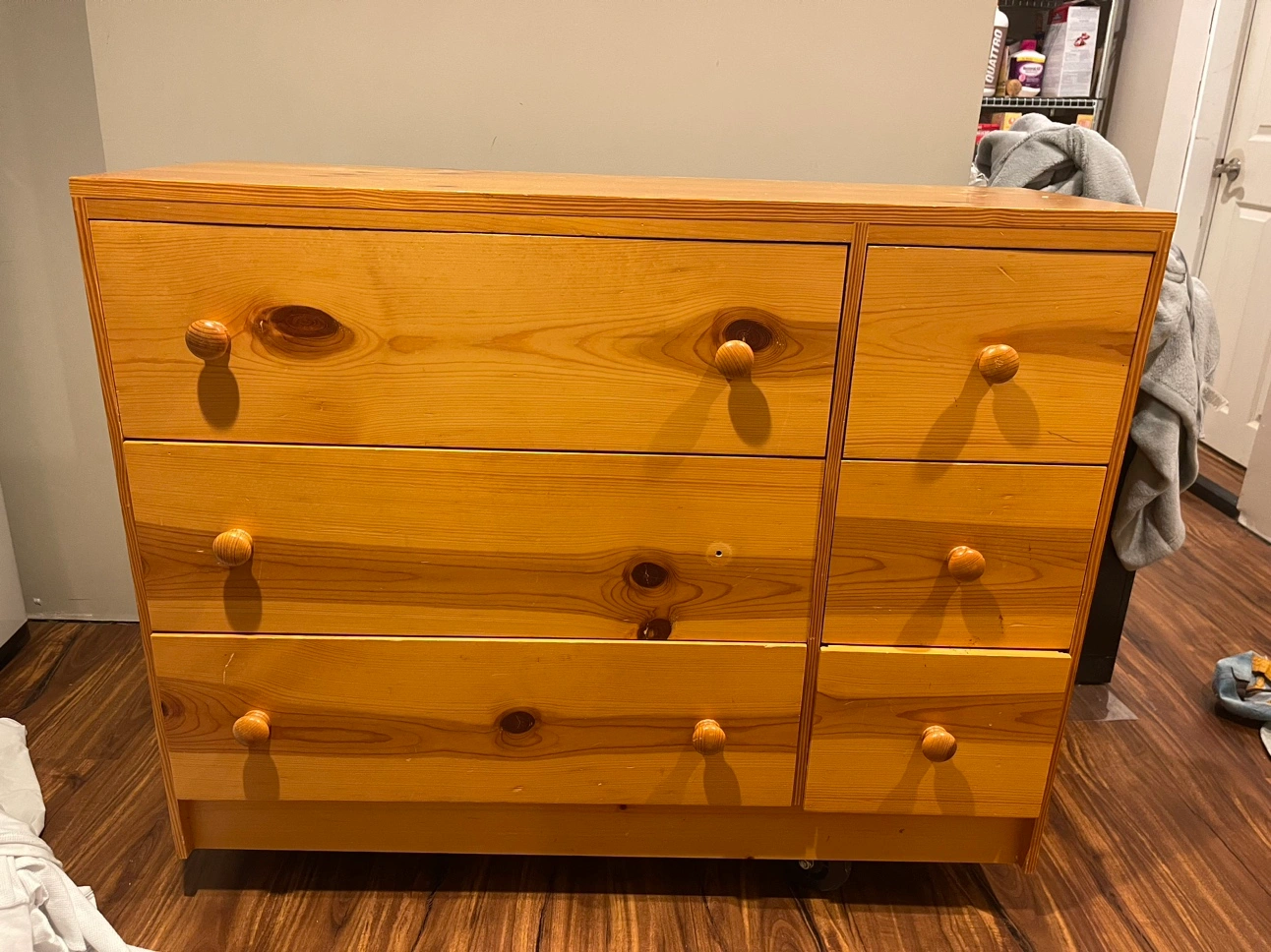 Solid wood hand made dresser. One knob is off but I have the knob. You just need a screw.
