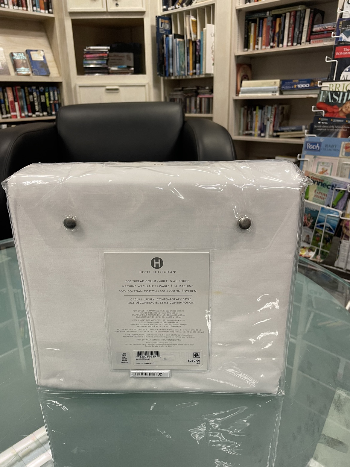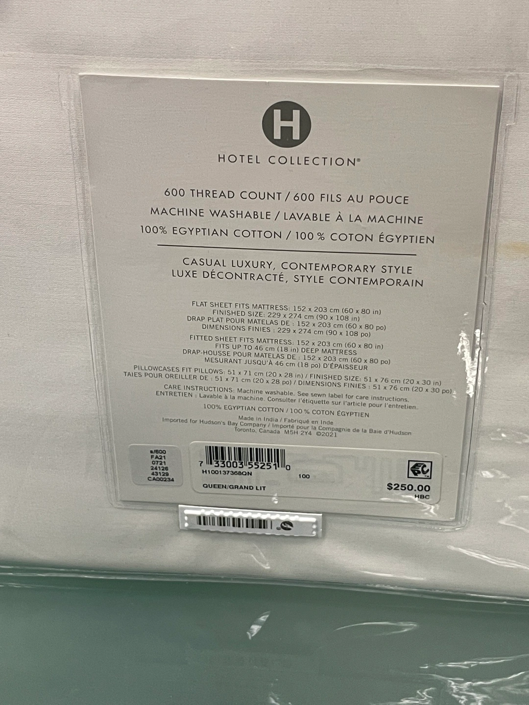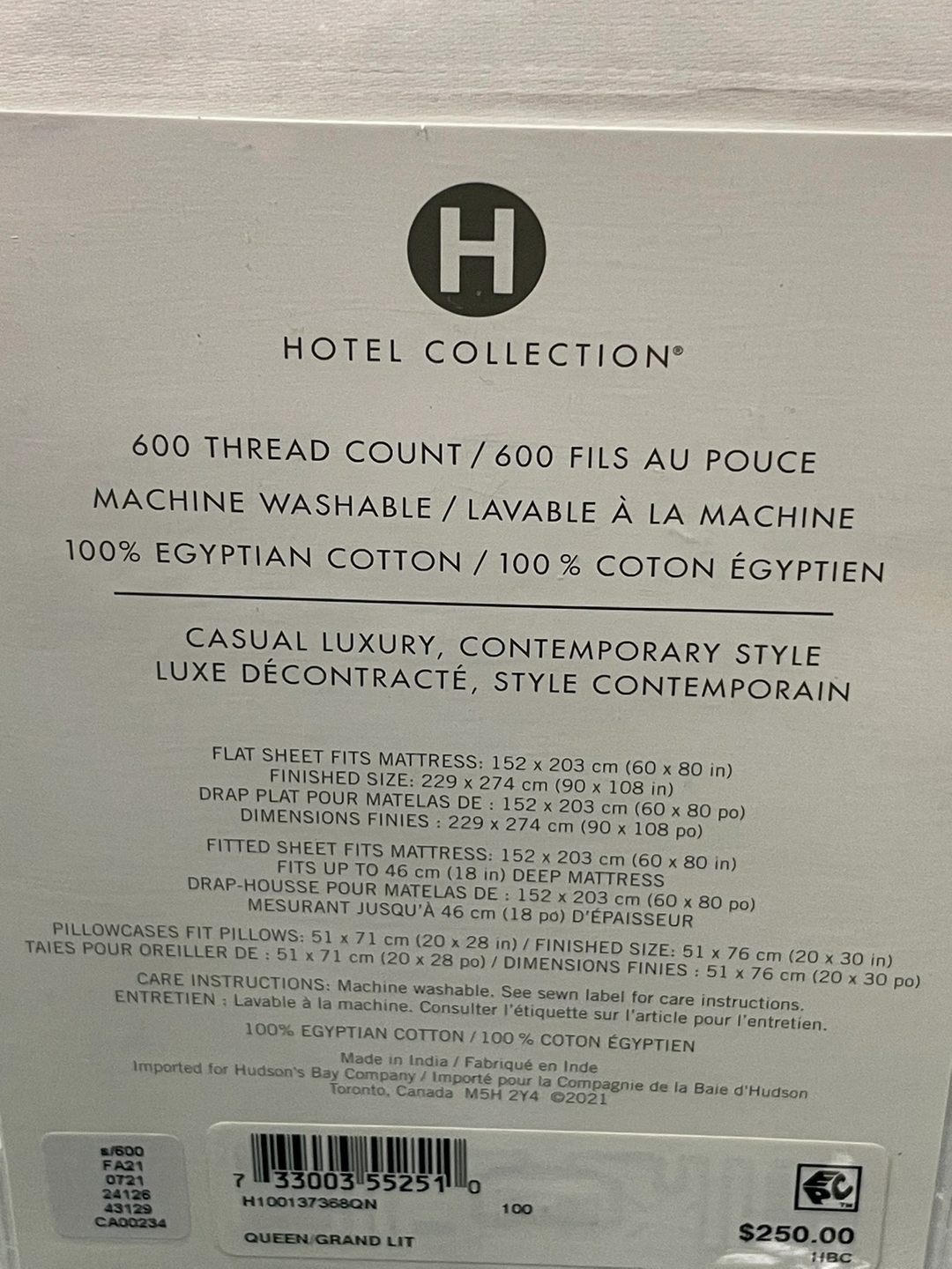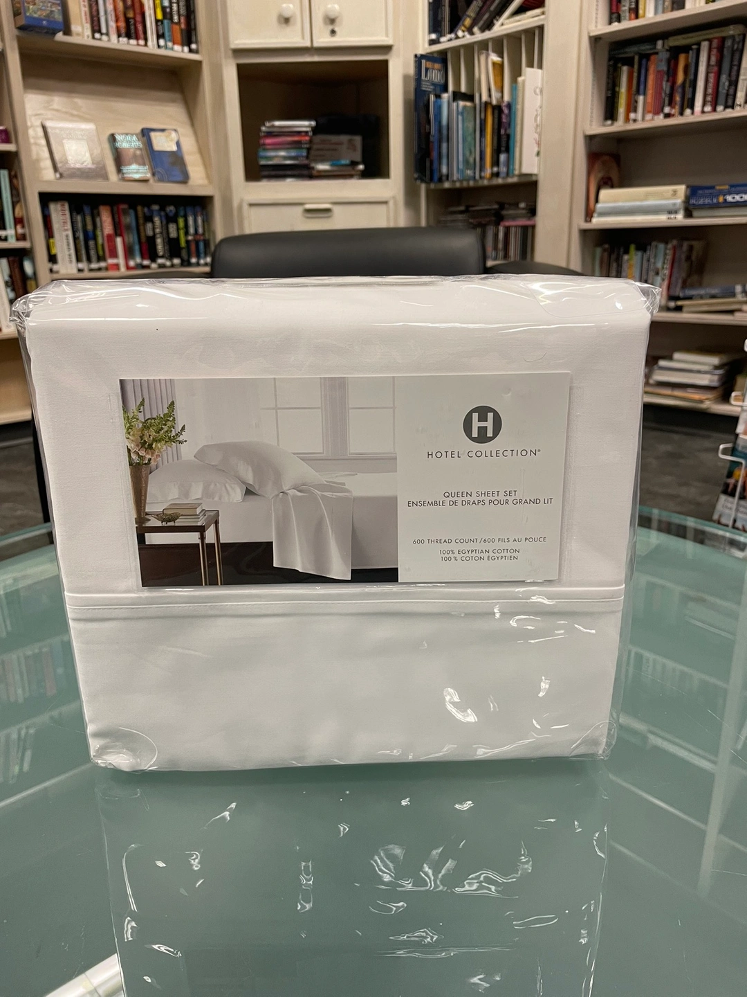 Selling brand new HOTEL COLLECTION white queen size sheet set. Feel the luxury of 600 Thread count 100% Egyptian cotton sheets. Includes 1 Flat Sheet, 1 Fitted Sheet ans 2 Standard Pillowcases. Purchased wrong size. Comes from pet & smoke free home. Condition is 10/10. Pick up is Queen's Quay W. and York St. no shipping or trades. $100 OBO. Need gone ASAP.