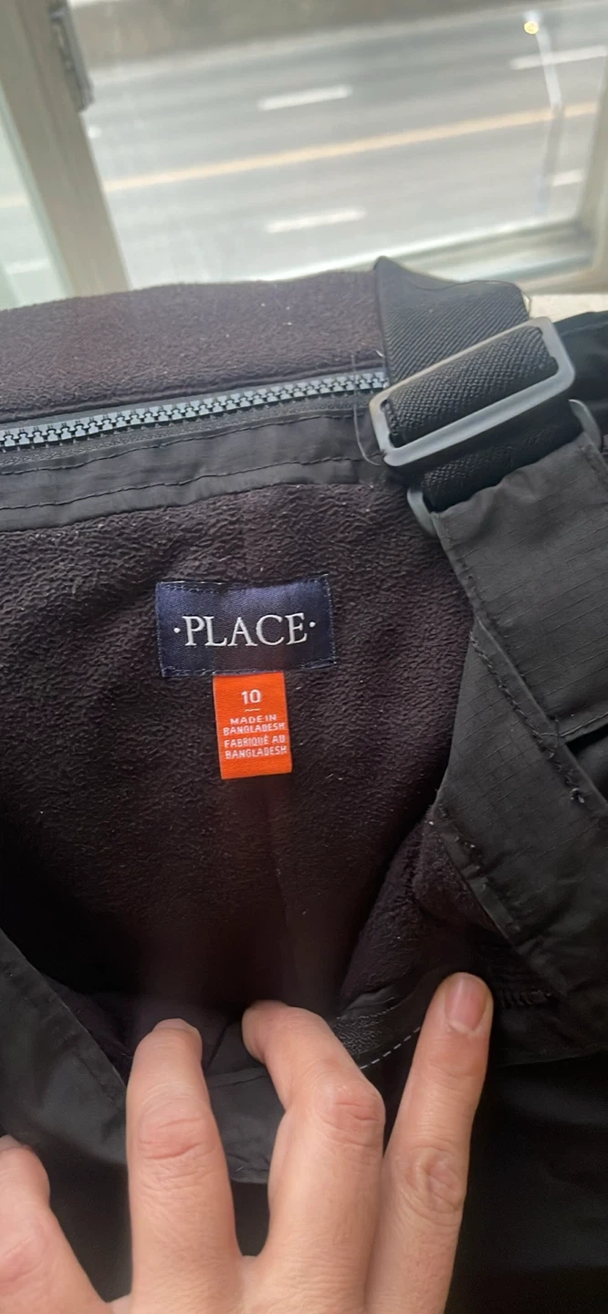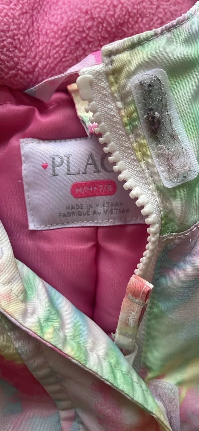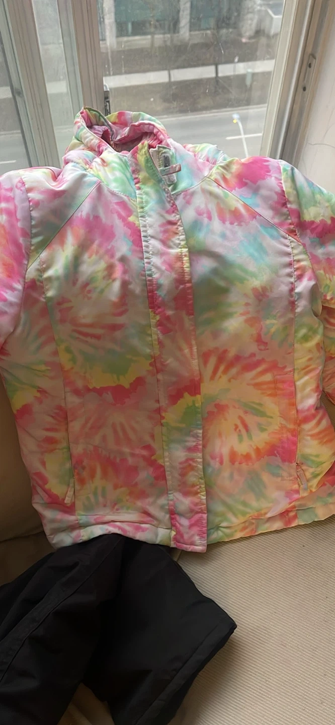 This is a tie-dye jacket and black snow pants set from The Children's Place. The jacket is size M (7/8) and made in Vietnam. The snow pants are size 10 and made in Bangladesh. Perfect for keeping kids warm and dry during colder weather!