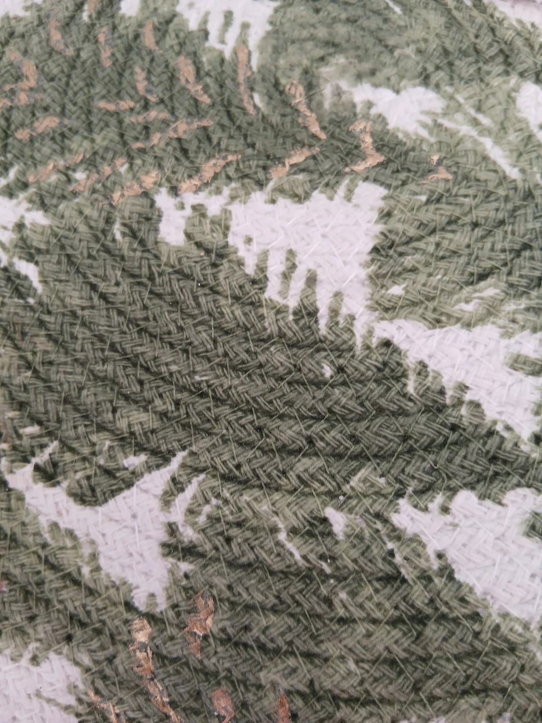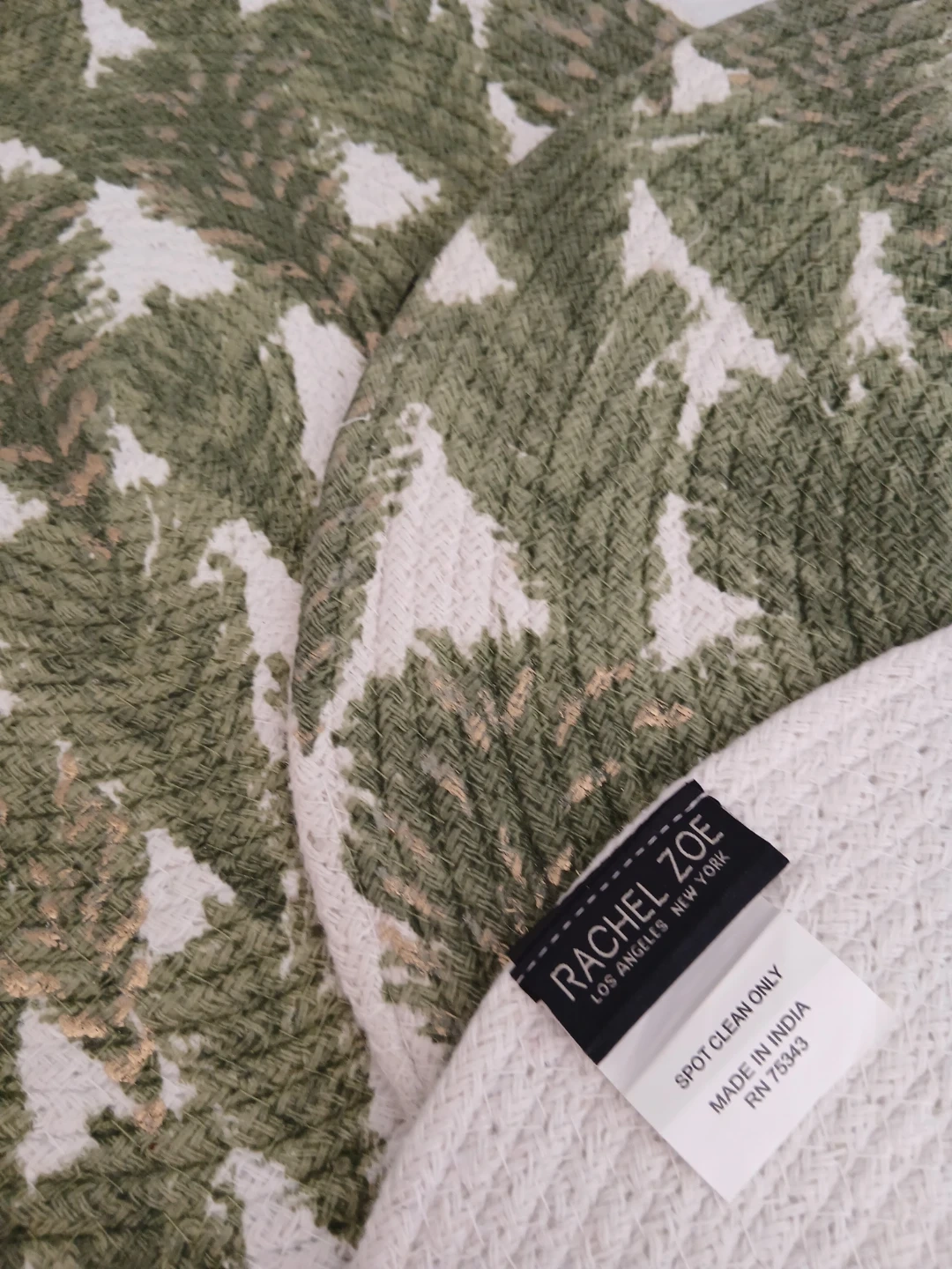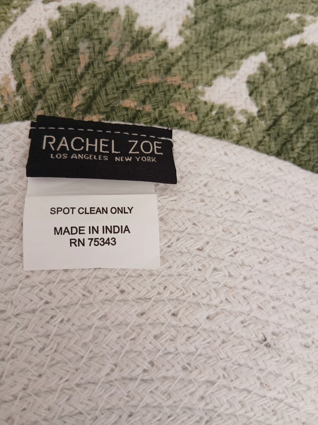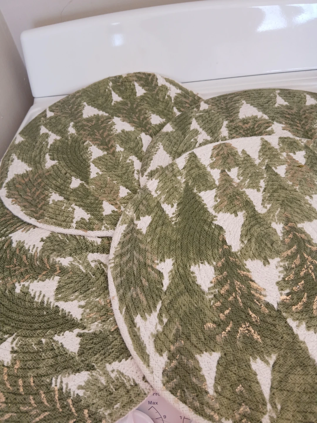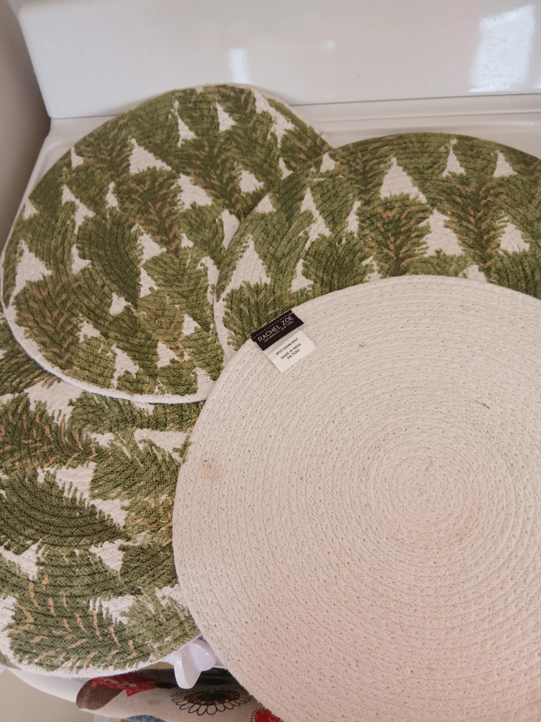 Set of four Rachel Zoe placemats with a green fern pattern. Spot clean only. Made in India. These would be lovely for a holiday or everyday dining setting!