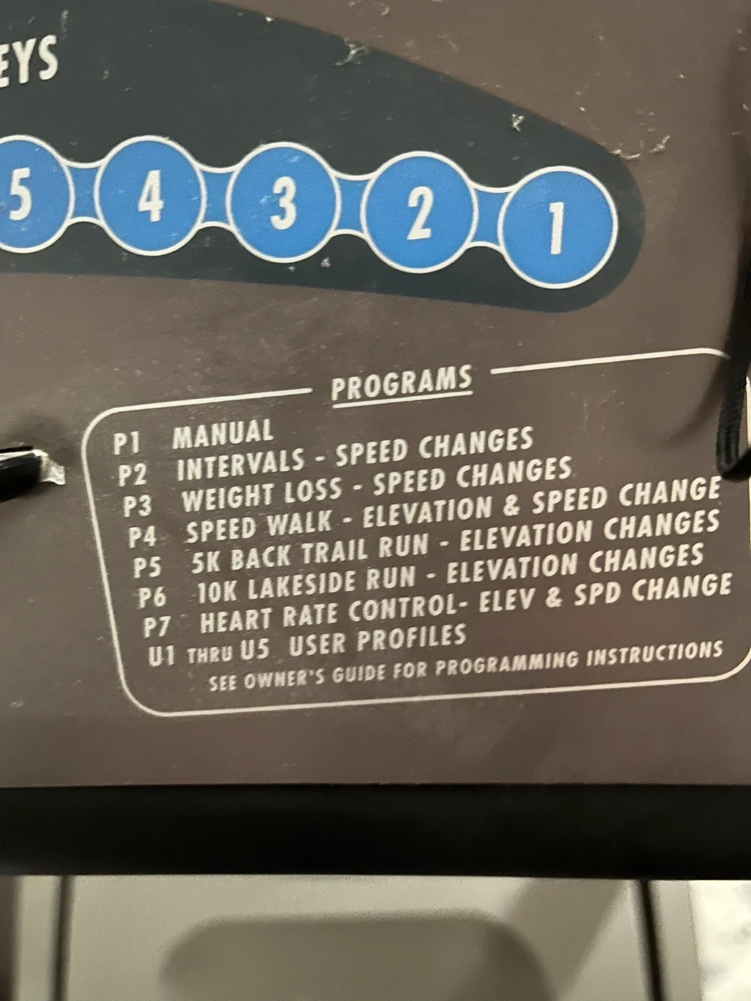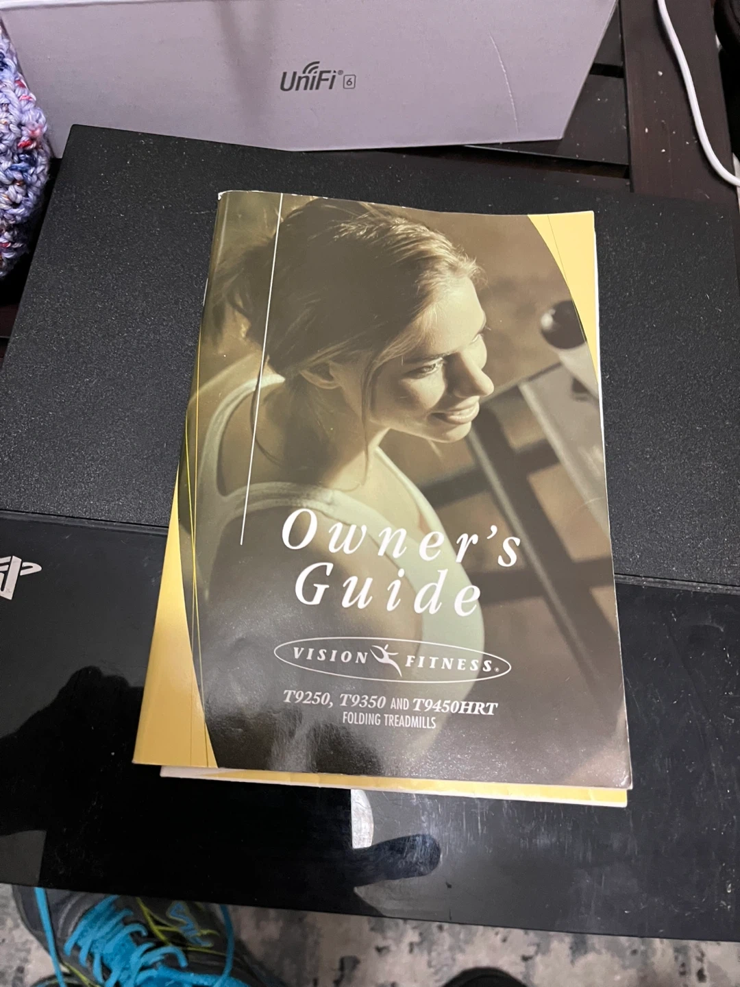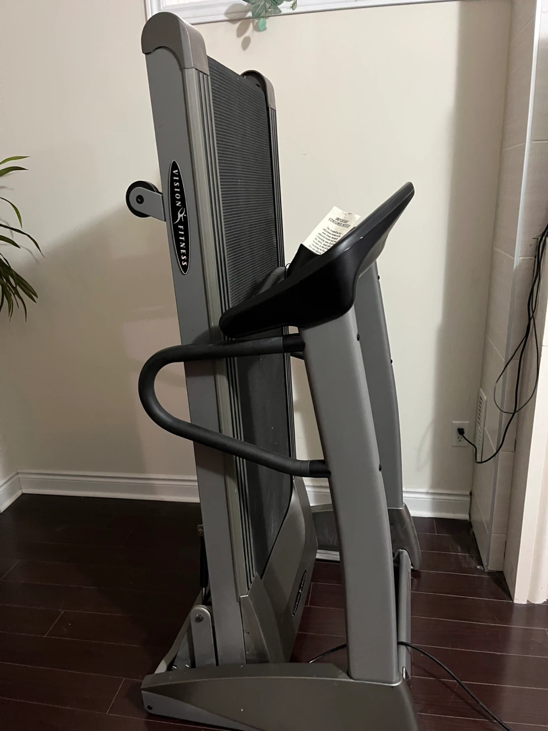 Selling a Vision Fitness treadmill, model T9450HRT. It has different programs like weight loss, speed walk, 5k back trail run, and heart rate control. The display shows time, distance, and calories burned. It also has quick keys for speed and elevation. Paid 2,000 before tax
