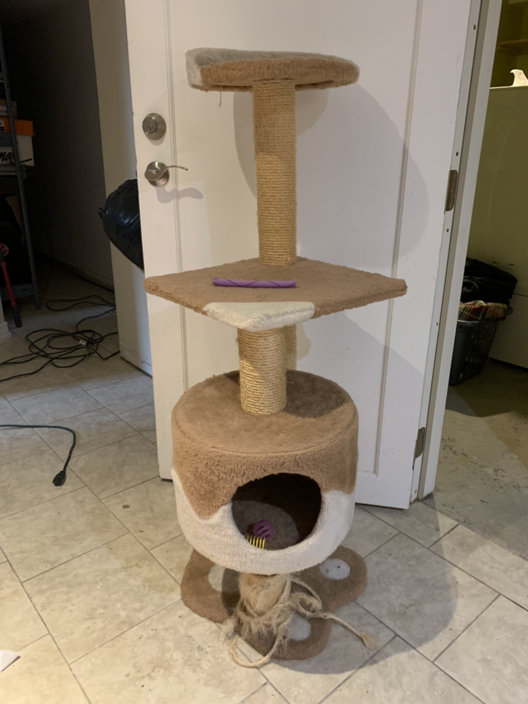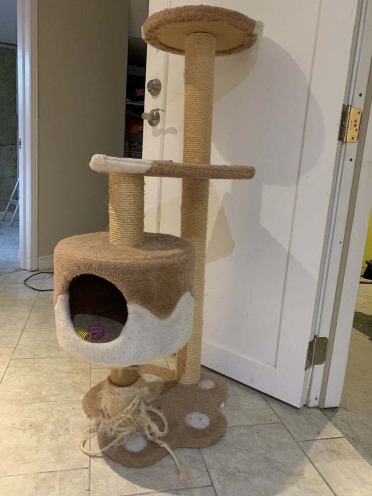 104Cat Tower with den, scratching post and top area to perch from to see outside or stay well above pet dog!!