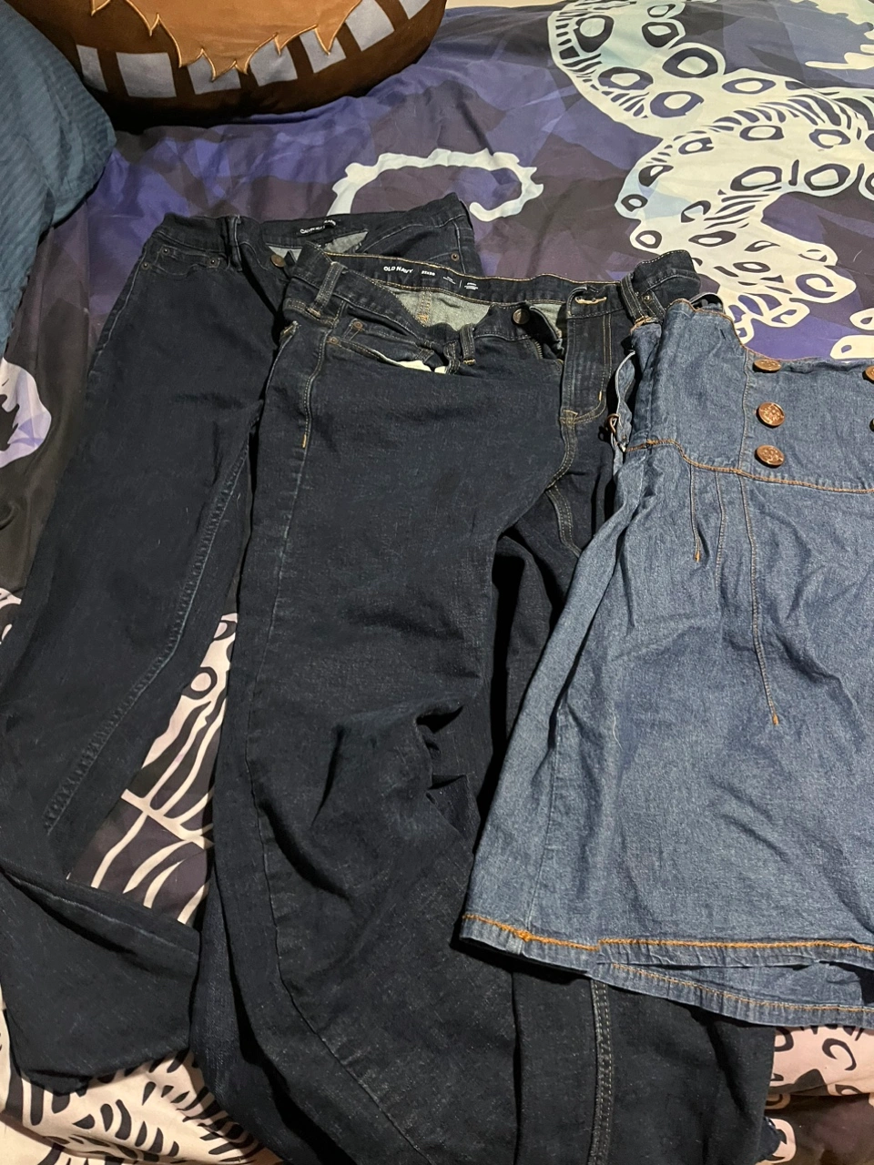 2 pairs of jeans, size 10. One Calvin Klein, one old navy. Also a very cute Jean overall dress that’s about a size 4. There have been dresses and sweaters added to this.