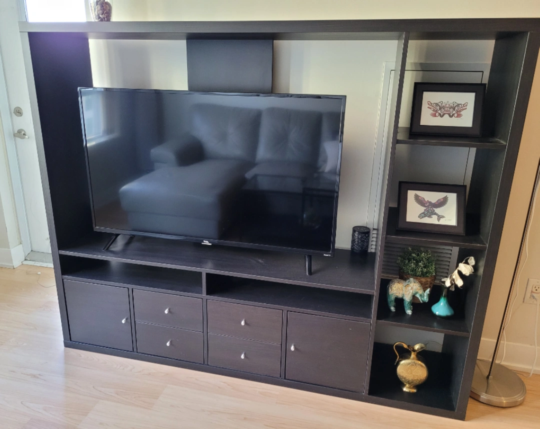 Large TV wall shelving unit in a dark chestnut brown. TV pictured is around 43", there's space for a bigger TV. Very good condition, no major damage.
