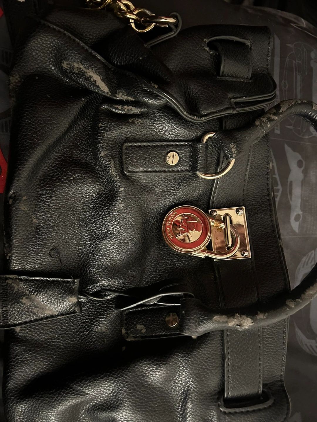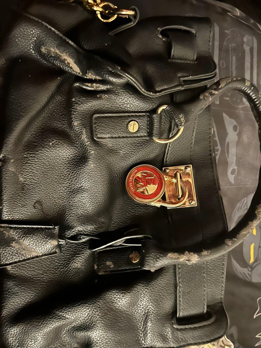 Medium size black bag. Zippers work but leather skin is shedding. Can be replaced but overall nice purse