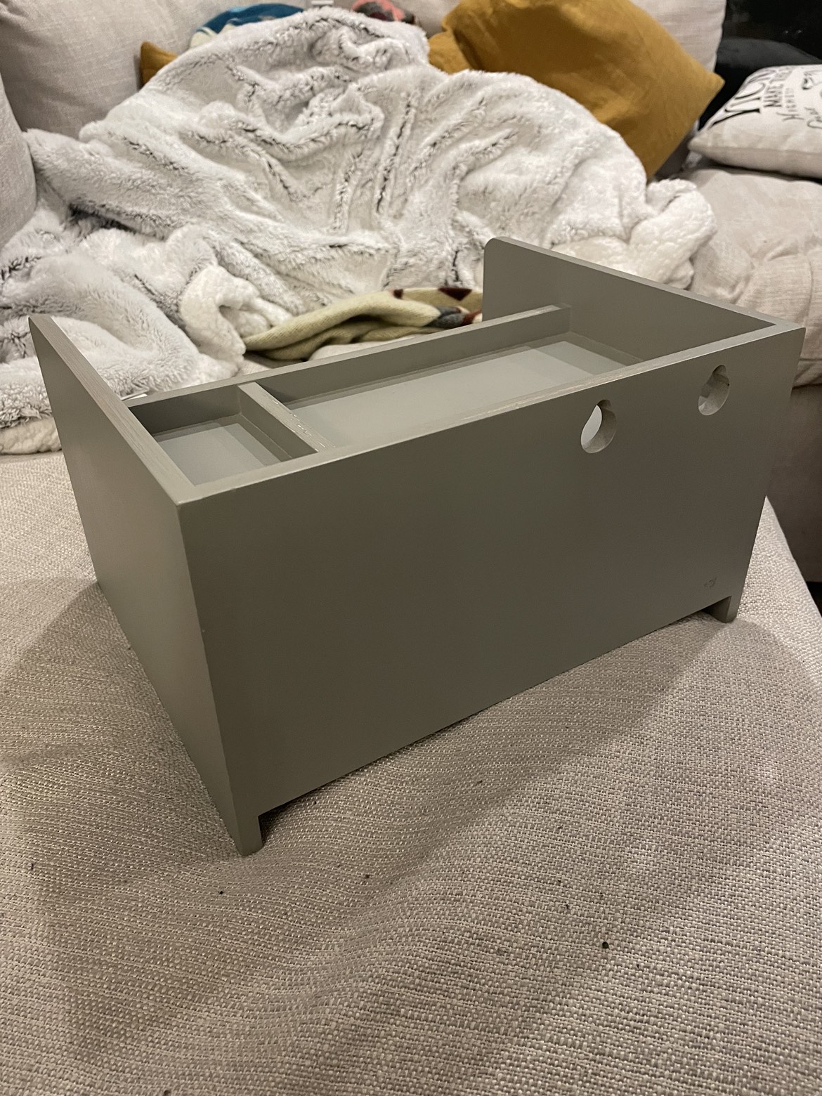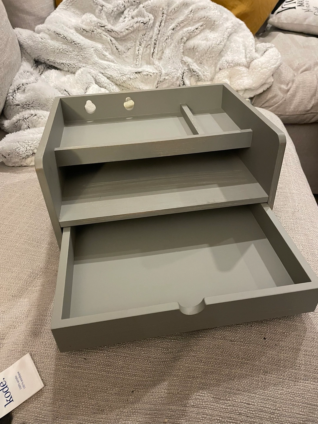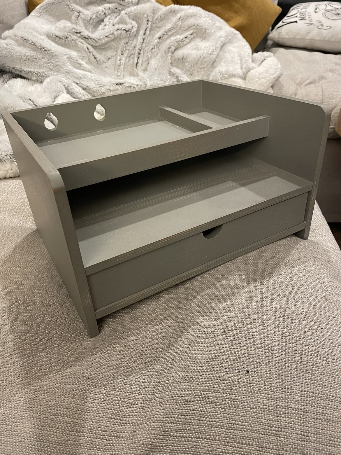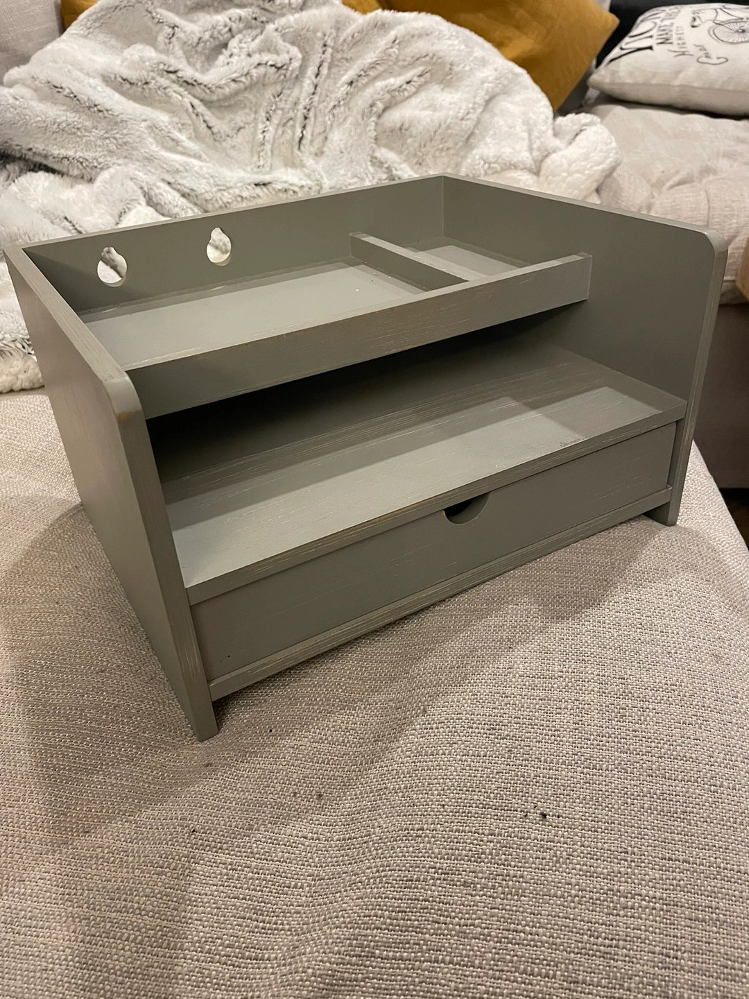 This is an excellent quality, solid wood desktop organizer. Has a drawer and holes to feed your cords through.