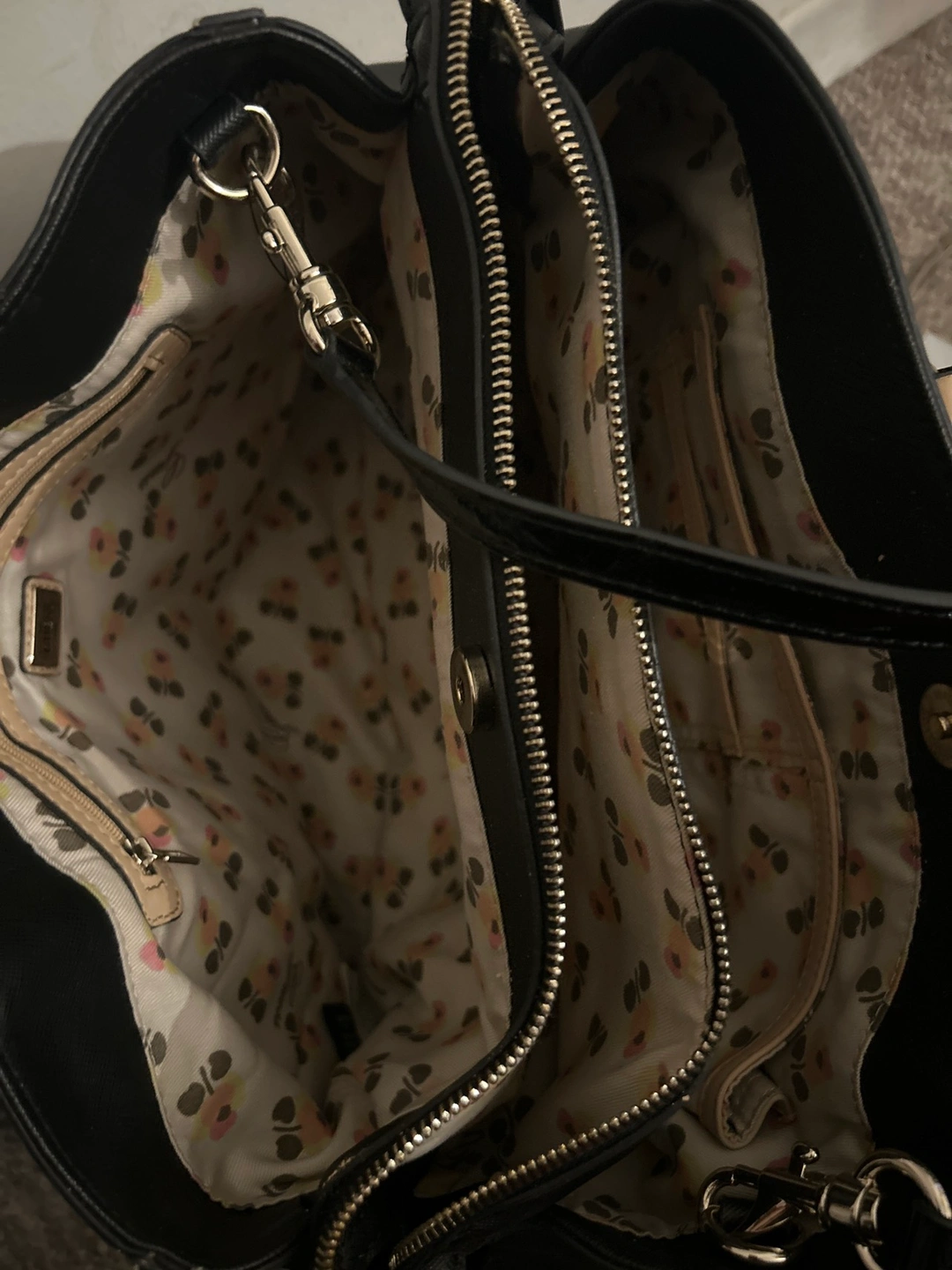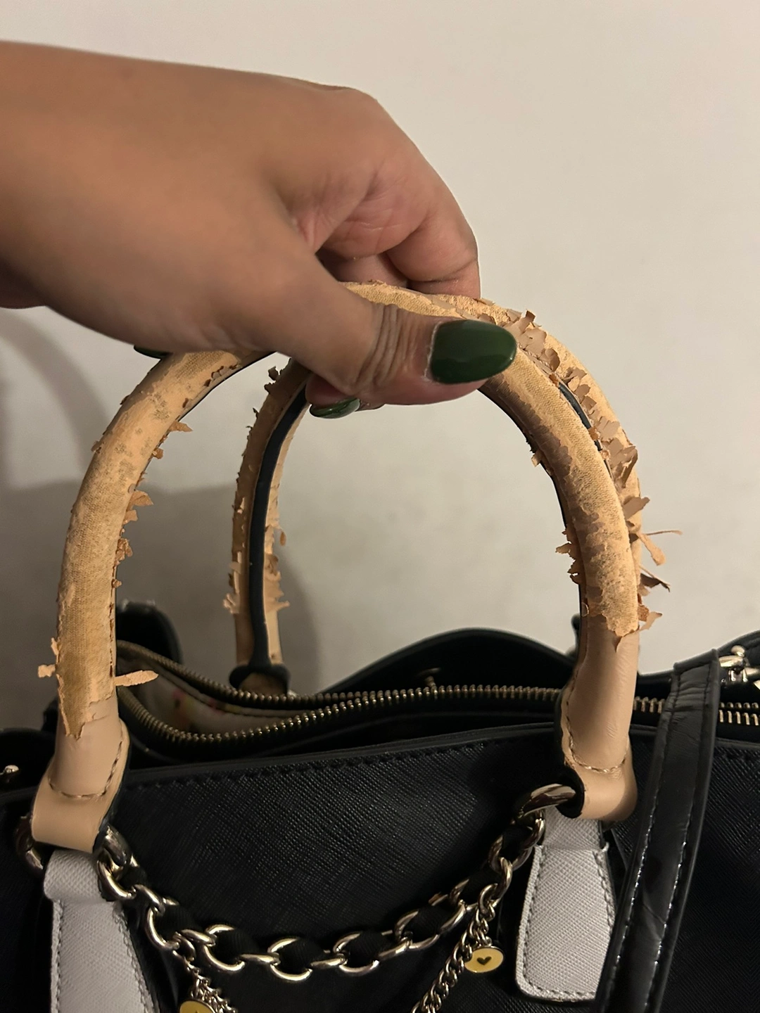 Bag has many components and is super nice. Zippers work and also comes with extra straps. Needs to be cleaned and arms have leather coming off as seen in picture.