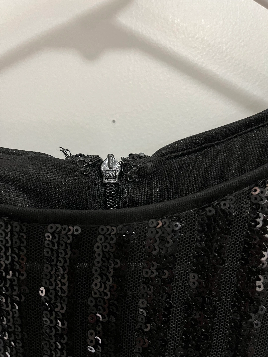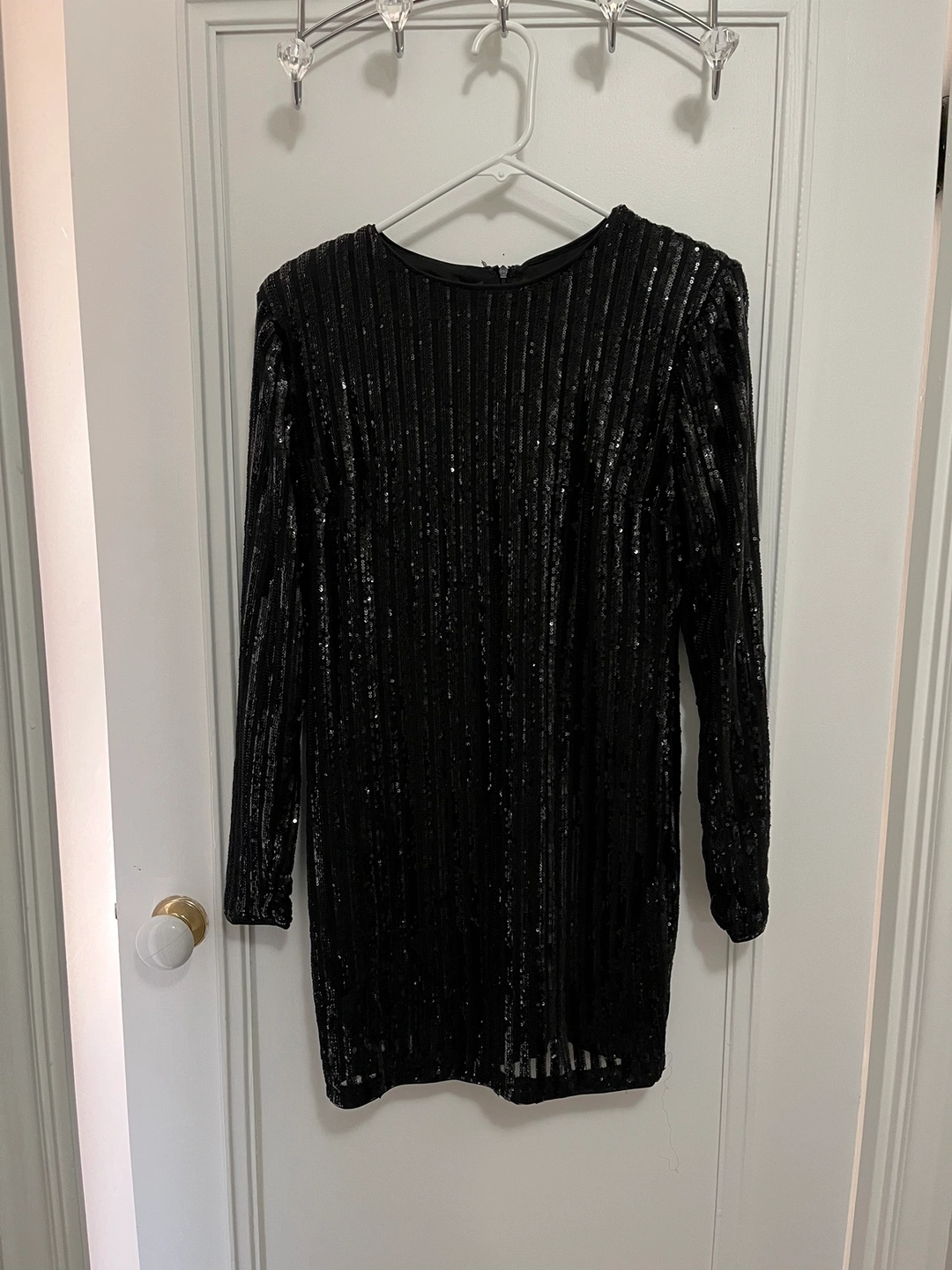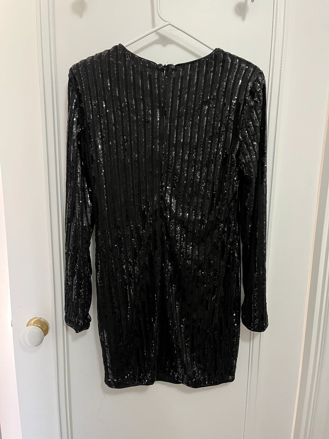 Long sleeve, short, black, sheath/midi dress (mid thigh), sequinned zip up. Worn once.