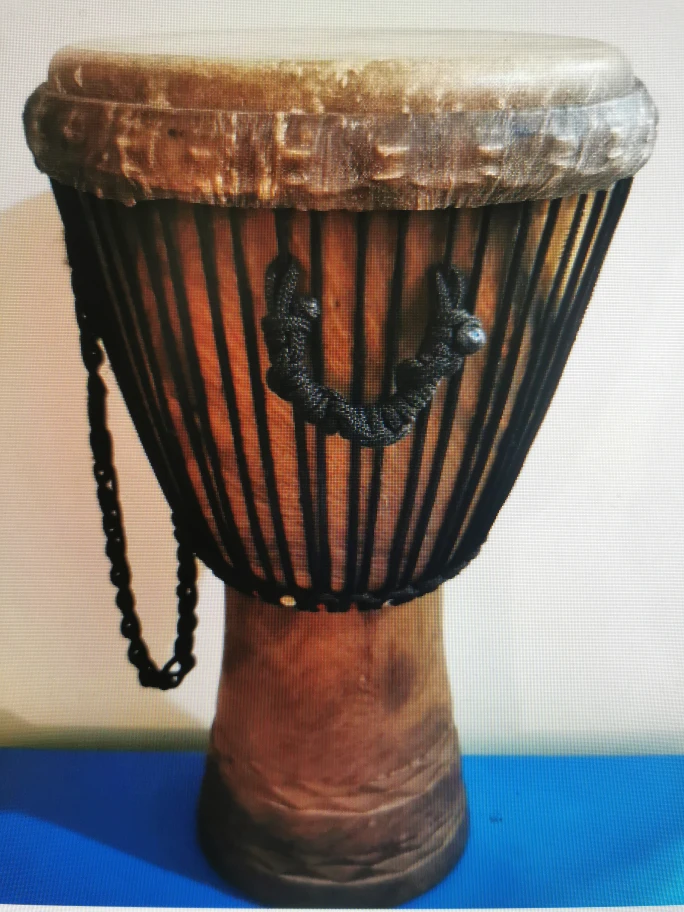This Djembe ( drum ) is approximately 22" tall and 12" wide on top. Body and top are in very good condition, with no rips or tears.