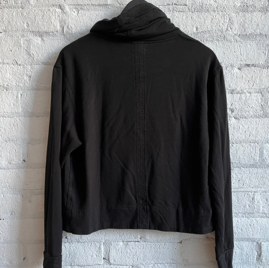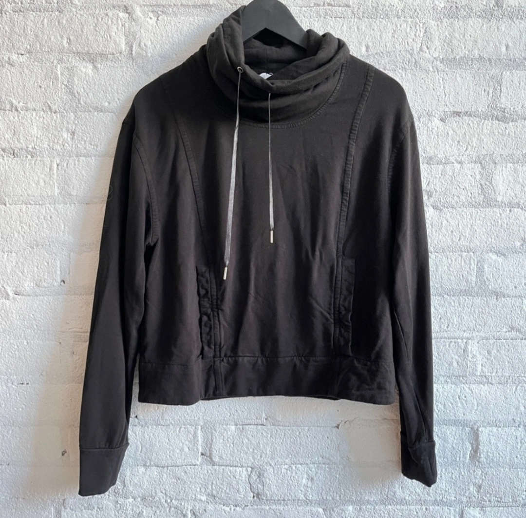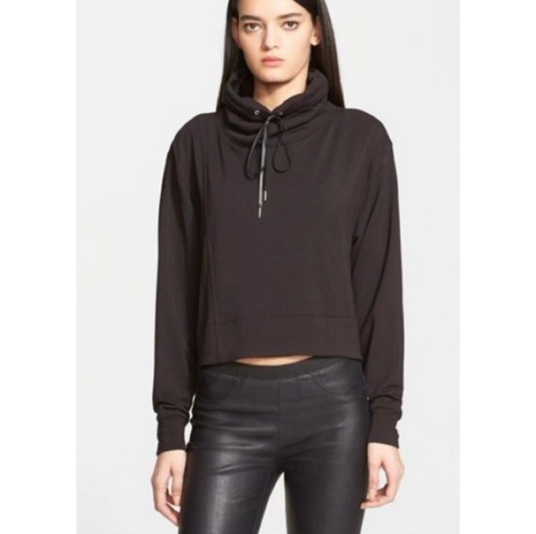 Funnel neck sweatshirt in black. A slouchy top cinched by a glossy drawstring balances the sporty aesthetic of a drop-shoulder pullover with street-smart style.