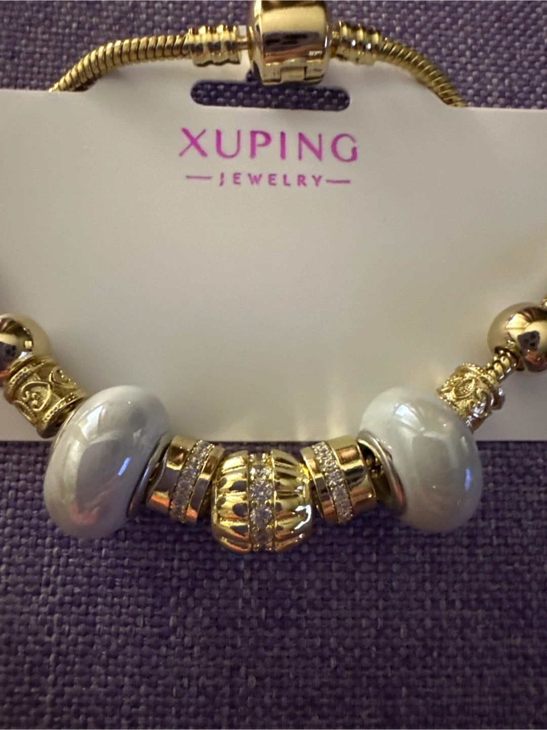 This is a gold-tone charm bracelet from Xuping Jewelry. It features gray beads and decorative charms, some with rhinestones. It's designed as a snake chain style bracelet.