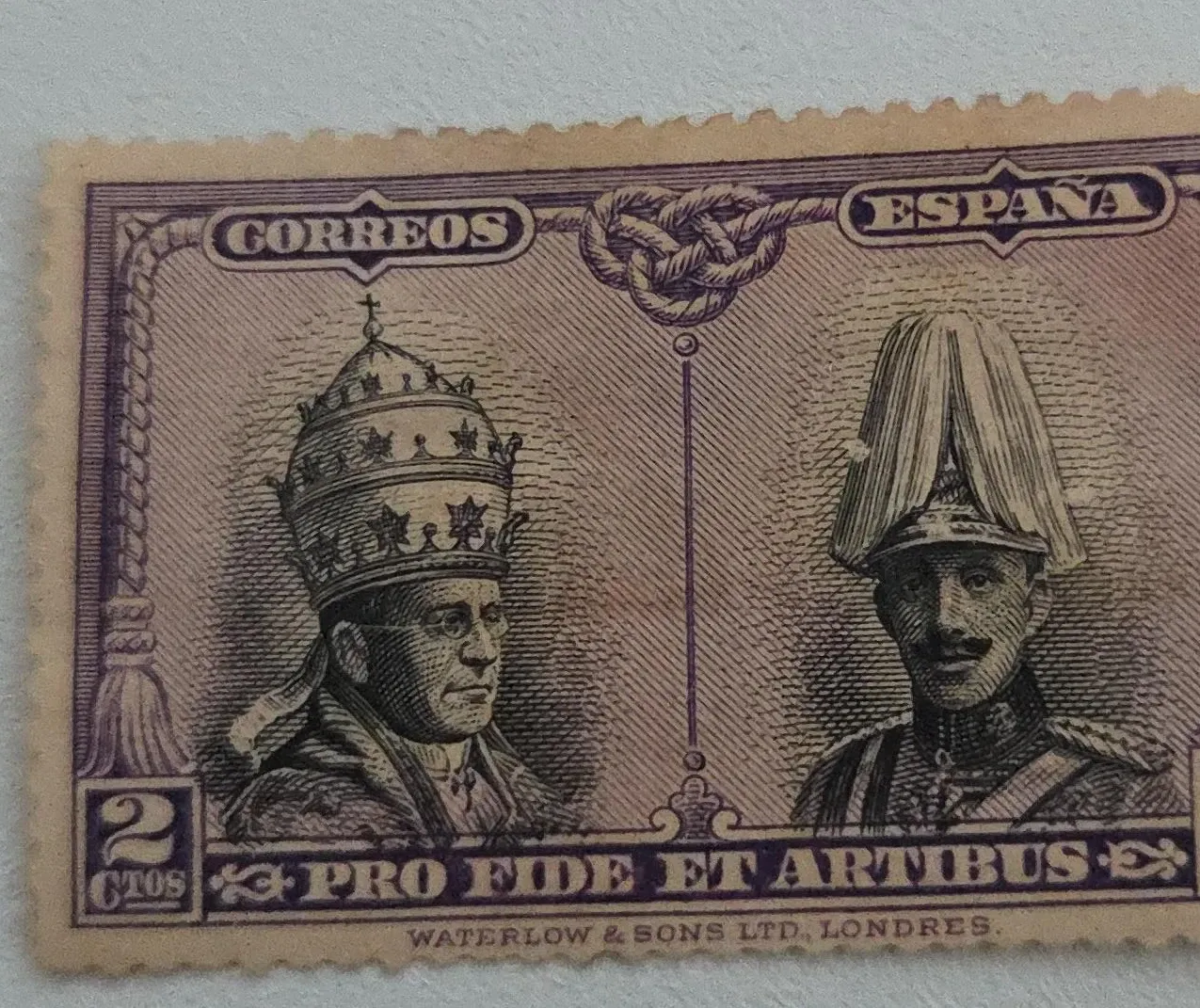 This is a vintage postage stamp from Spain featuring the motto 'Pro Fide Et Artibus'. It was printed by Waterlow & Sons Ltd. in London. The denomination is 2 centimos.