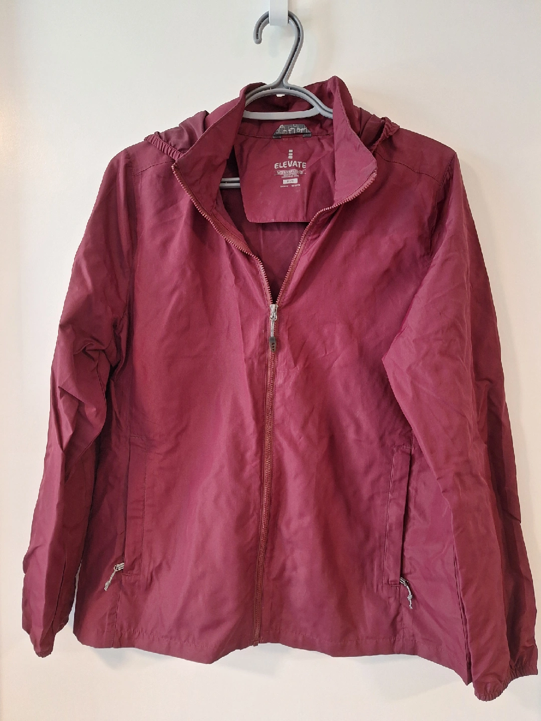 Elevate women's jacket in a lovely burgundy colour! It's a size M. Perfect for those cooler days or evenings out and about. Water and wind resistant.