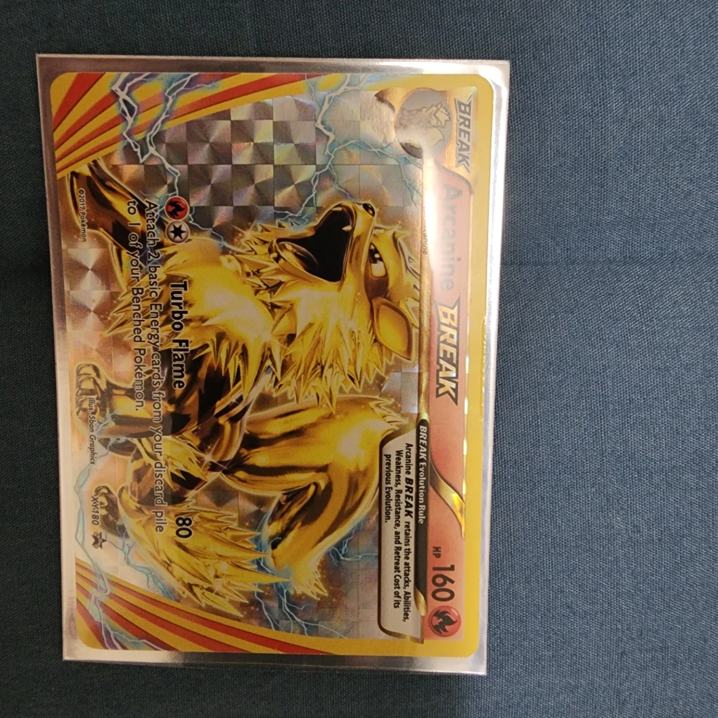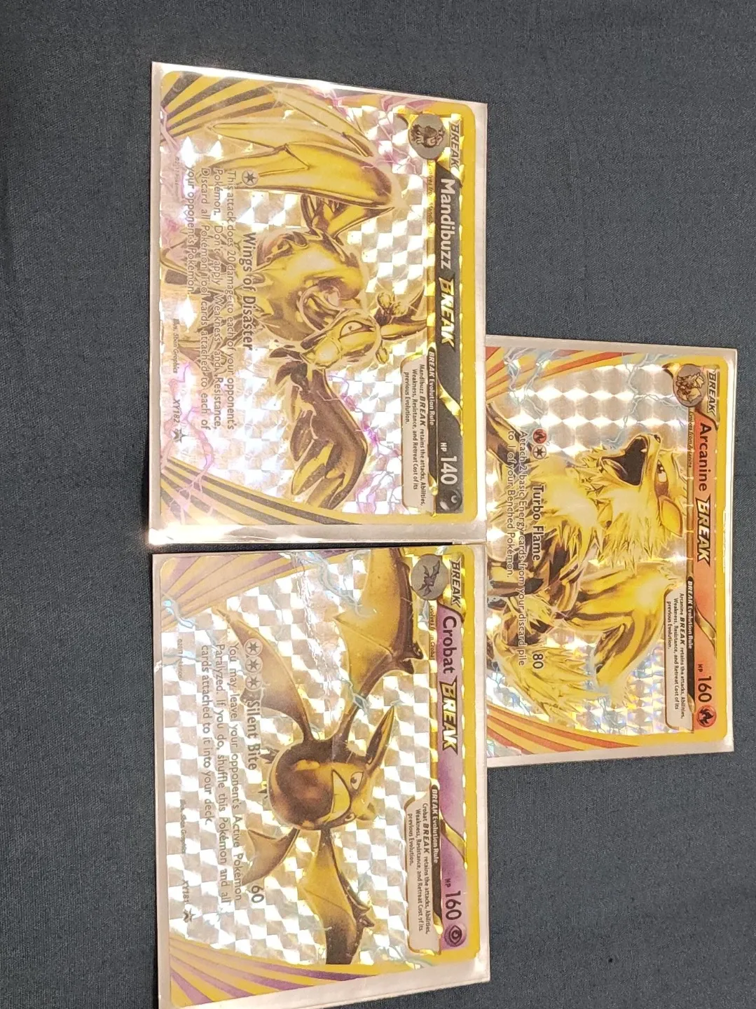 Includes Arcanine BREAK, Mandibuzz BREAK, and Crobat BREAK trading cards. These cards feature holographic, golden artwork. Suitable for Pokémon TCG collectors.