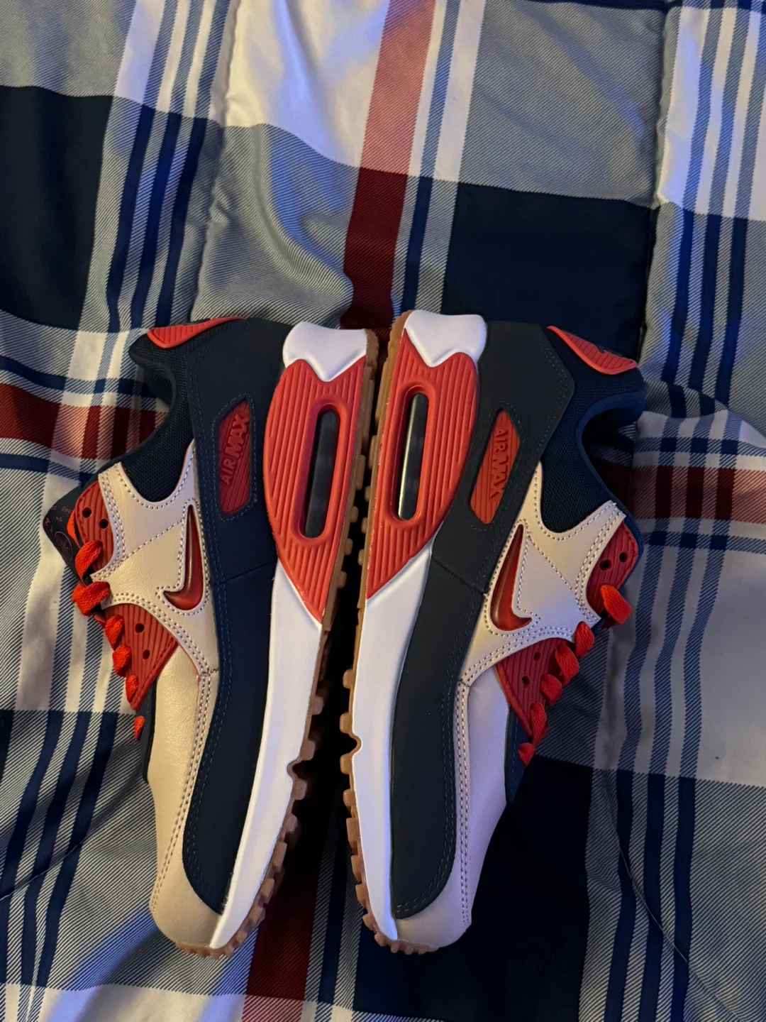 Nike Air Max 90 sneakers. These shoes feature a mix of leather and synthetic materials. The colourway includes navy, red, and tan accents with a white midsole and gum outsole. Size 9.5 US MEN