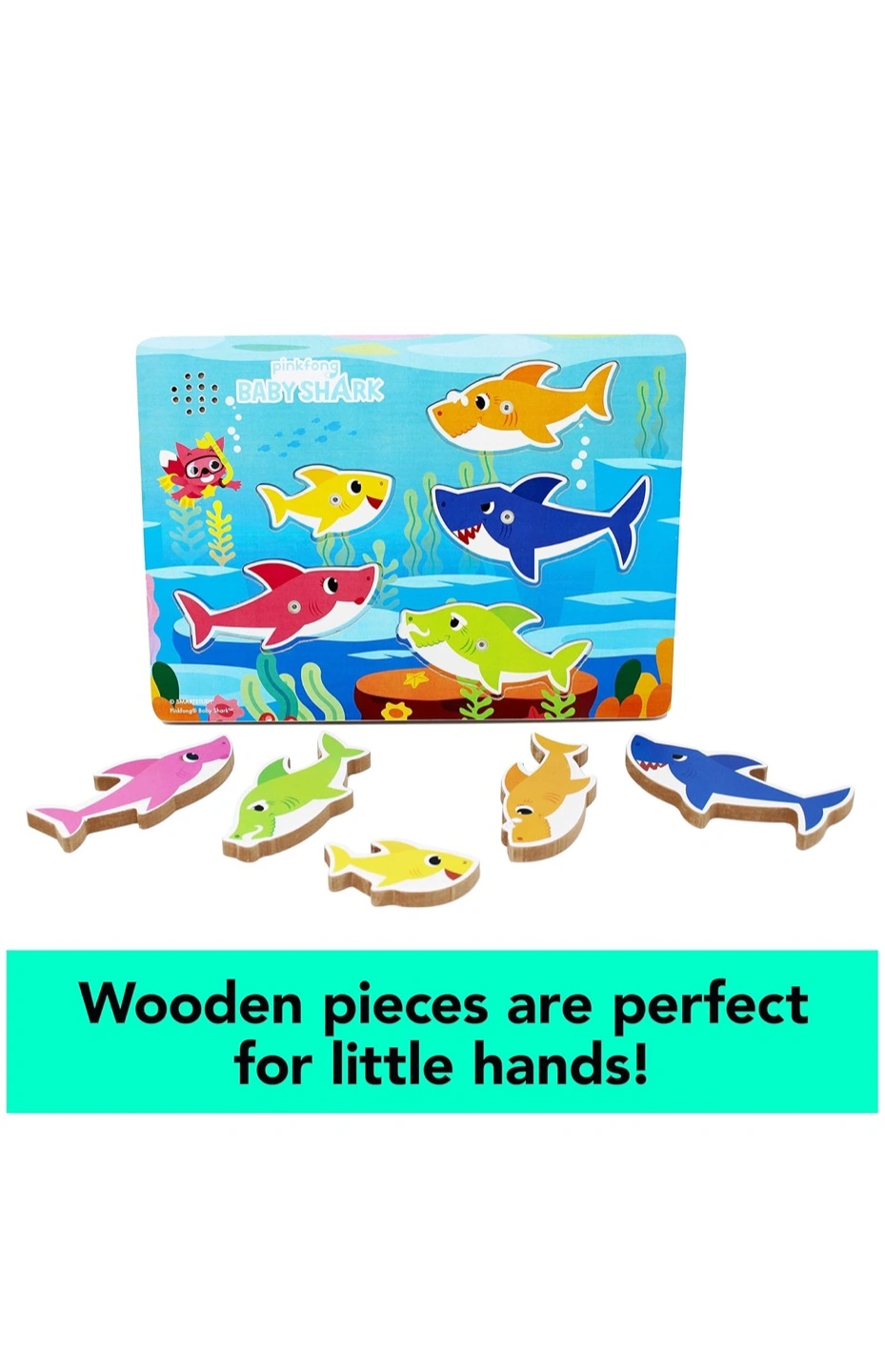 This is a Pinkfong Baby Shark musical wooden sound puzzle. It plays the viral Baby Shark song and has 5 pieces. Recommended for toddler ages 2 and up. Wooden pieces are perfect for little hands!