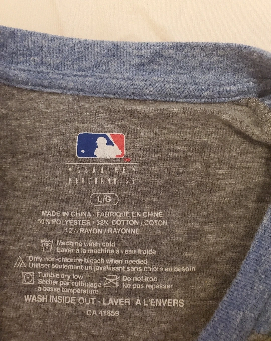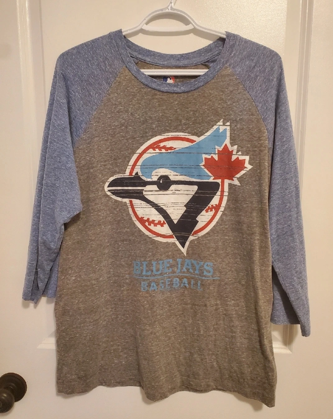 Genuine Merchandise Toronto Blue Jays baseball t-shirt. Raglan style with heather grey body and heather blue sleeves. Made from 50% polyester, 38% cotton, and 12% rayon. Great for any Blue Jays fan!