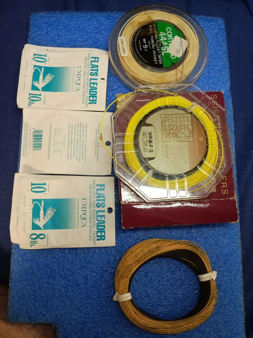 This lot includes a Scientific Anglers WF 5F floating rocket taper fly line and several Umpqua Flats Leaders. The leaders are hand-tied for bonefish, redfish, and other species, with butt diameters of 0.021" and tippet diameters of 0.011" and 0.012".