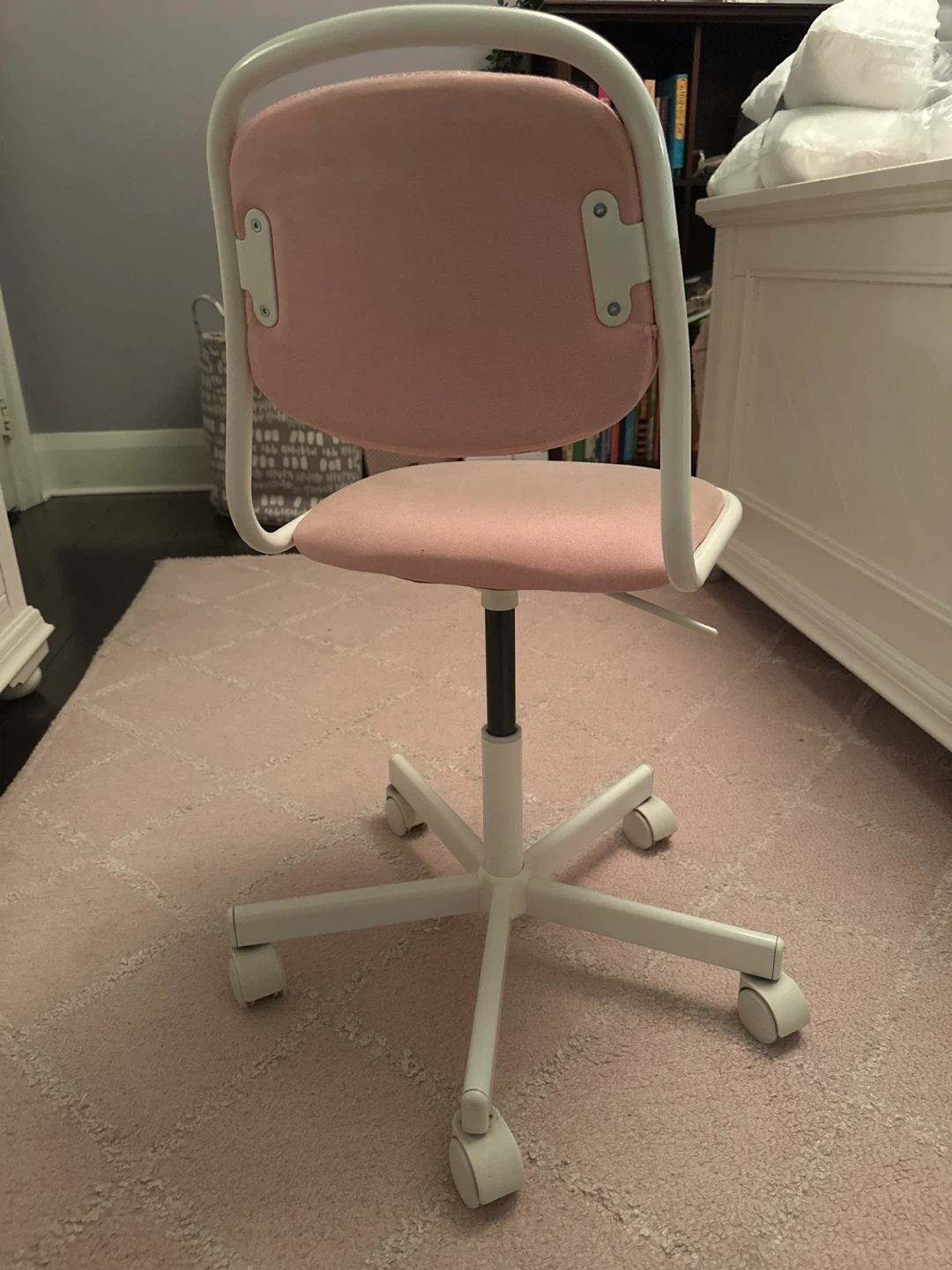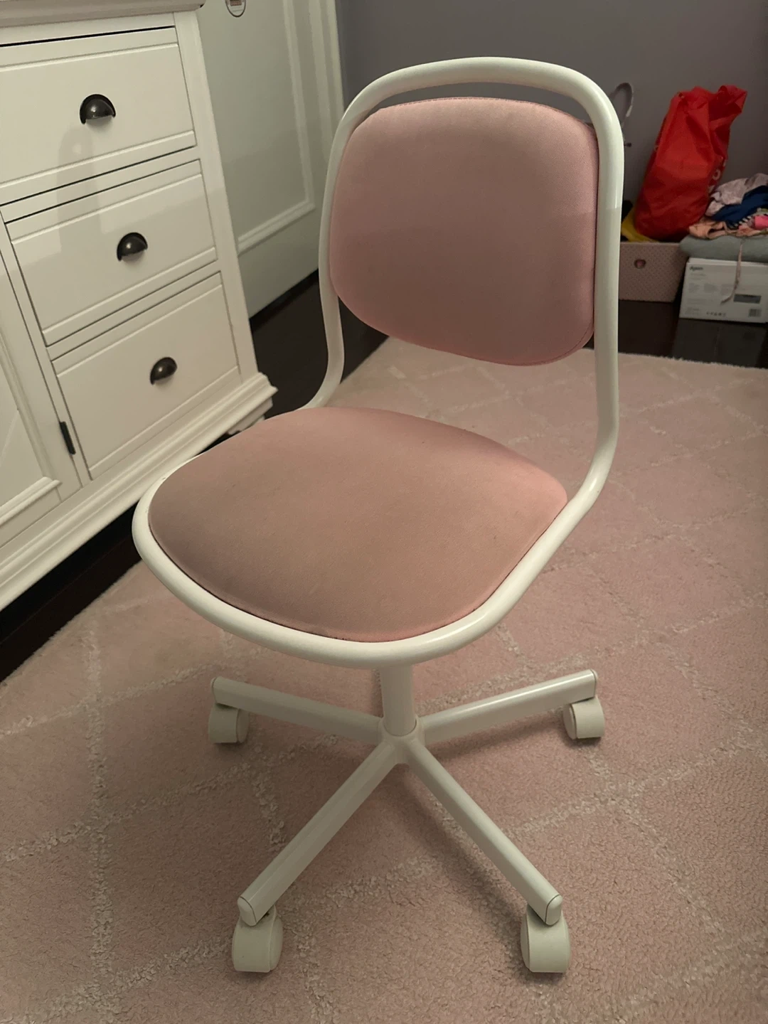 Selling a cute desk chair! It features a pink seat and backrest with a white frame. Perfect for a kid's room or home office