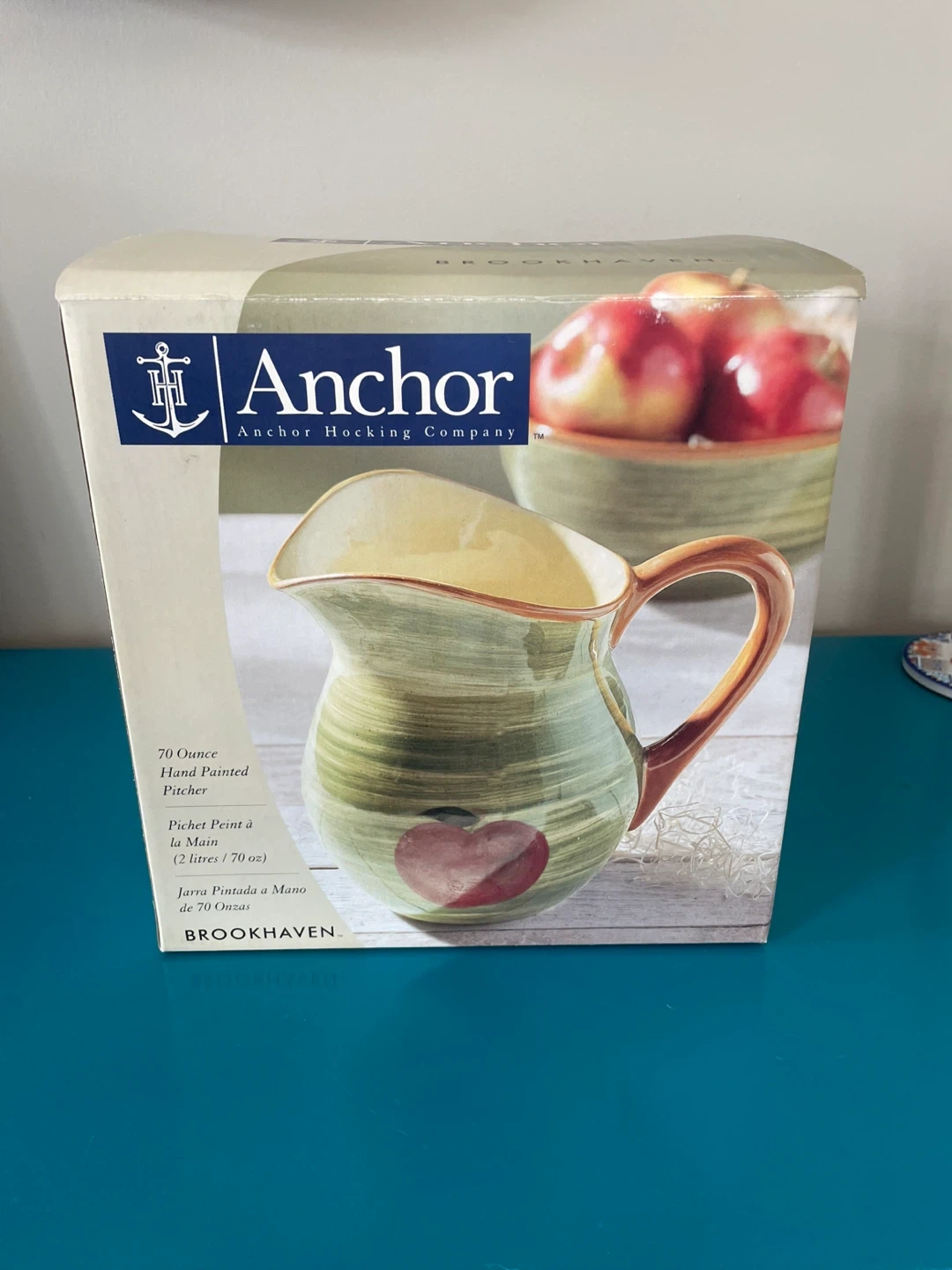 Beautiful , vintage, large 70-ounce pitcher from the discontinued Brookhaven collection by Anchor Hocking. This piece features a charming, rustic aesthetic with a hand-painted red apple motif and soft green brushstroke detailing, perfect for a farmhouse or "Cottagecore" kitchen.