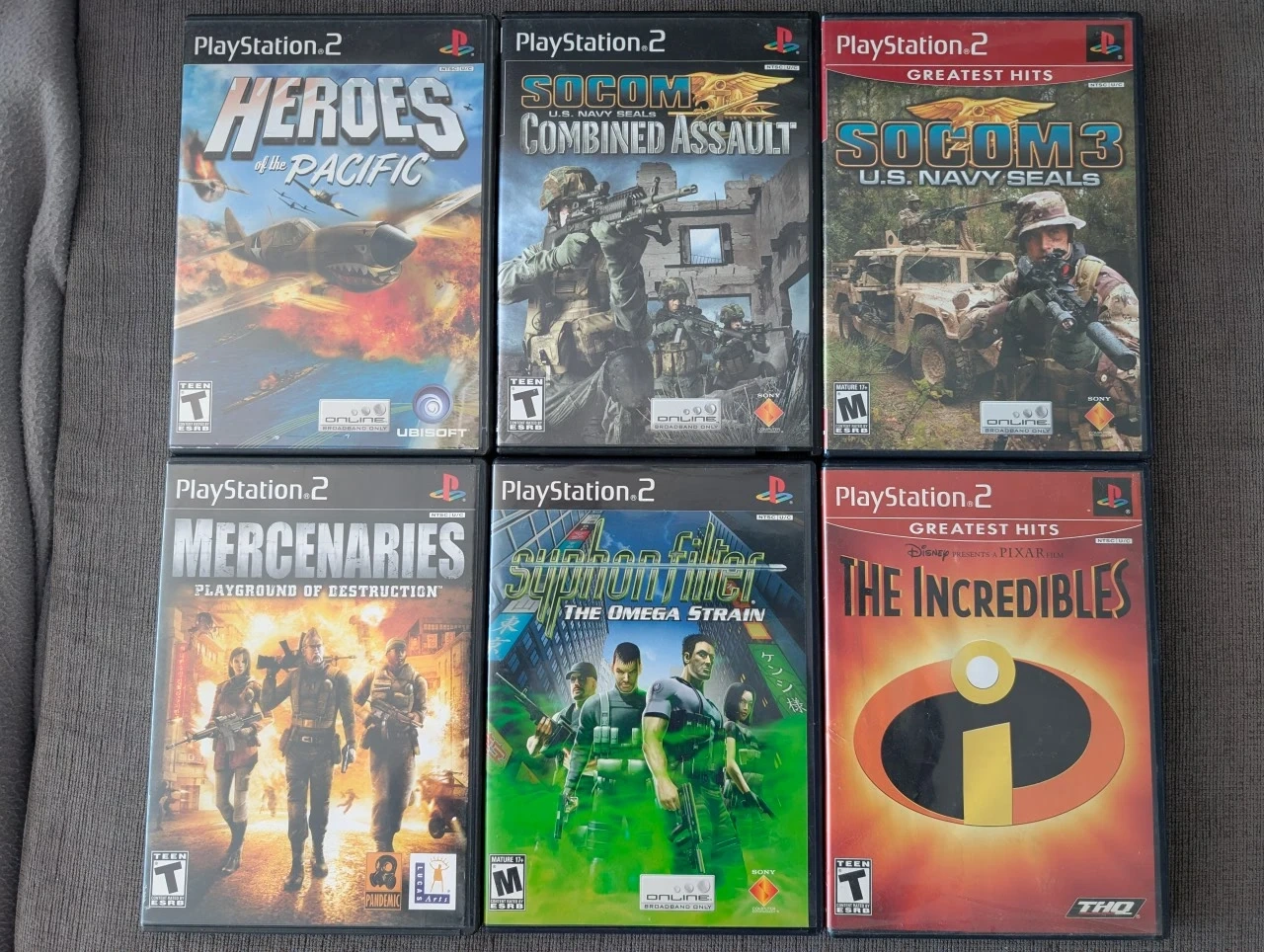 Bundle of six PlayStation 2 games, Heroes of the Pacific, SOCOM: Combined Assault, SOCOM 3,, Mercenaries, The Incredibles and Syphon filter the omega strain. Selling all together